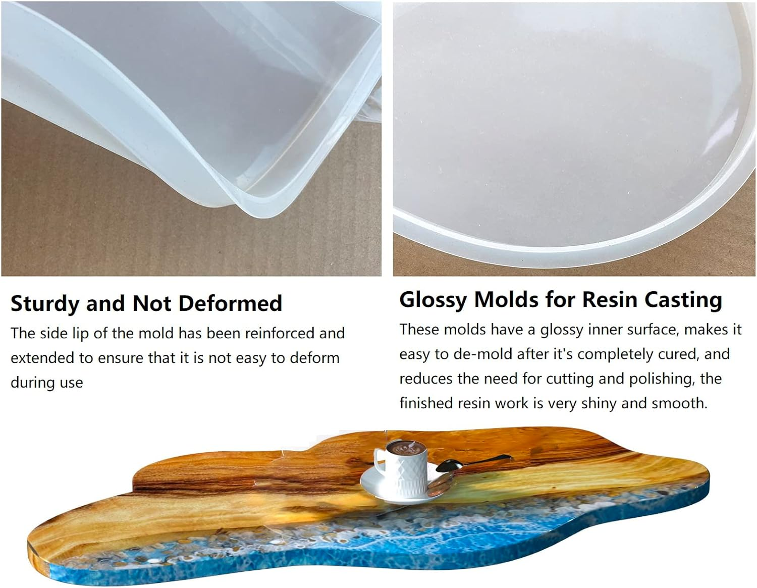 Large Resin Table Mold: you will get 1pcs table silicone mold, size 24*16 inches, depth 0.5in, it can be used to make various resin pouring projects such as coffee table serving tray cheese platter cutting board river table etc Sturdy and Not Deformed: The side lip of the mold has been reinforced and extended to ensure that it is not easy to deform during use Sturdy Silicone Material: the molds made of durable silicone material, superior high tear strength, easy to use and clean, compatible with epoxy resin, casting resin. Glossy Molds for Resin Casting: These molds have a glossy inner surface, the smooth interior makes it easy to de-mold after it’s completely cured, and reduces the need for cutting and polishing, the finished resin work is very shiny and smooth. Tips: if the mold causes deformation during transportation, you can add water to the mold and leave it for a few days, Silicone molds are cleaned with soapy or warm water before and after use, and mold demould agent are used, which can extend the service life Product Description Large Resin Table Mold 24inch Epoxy River Table Mold
