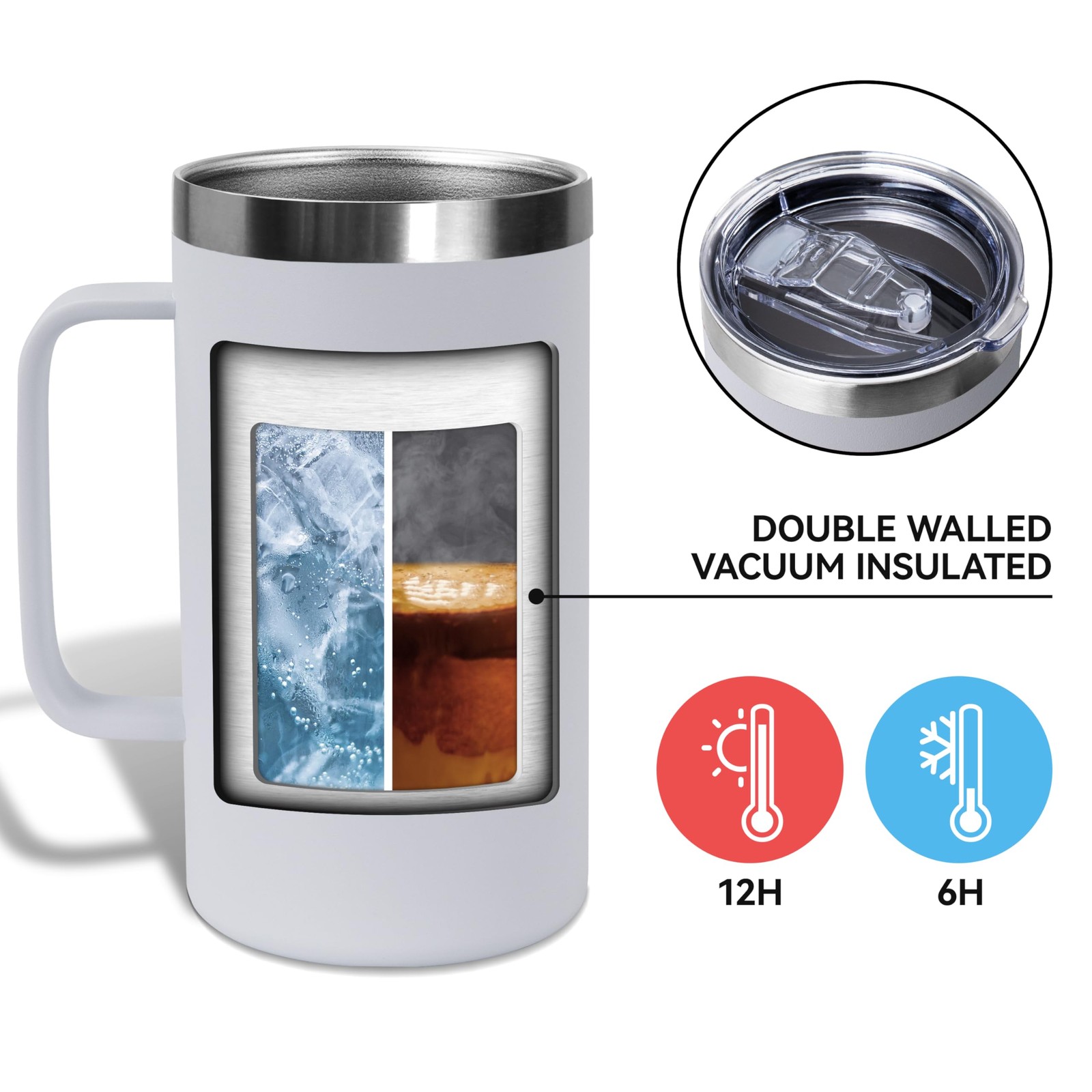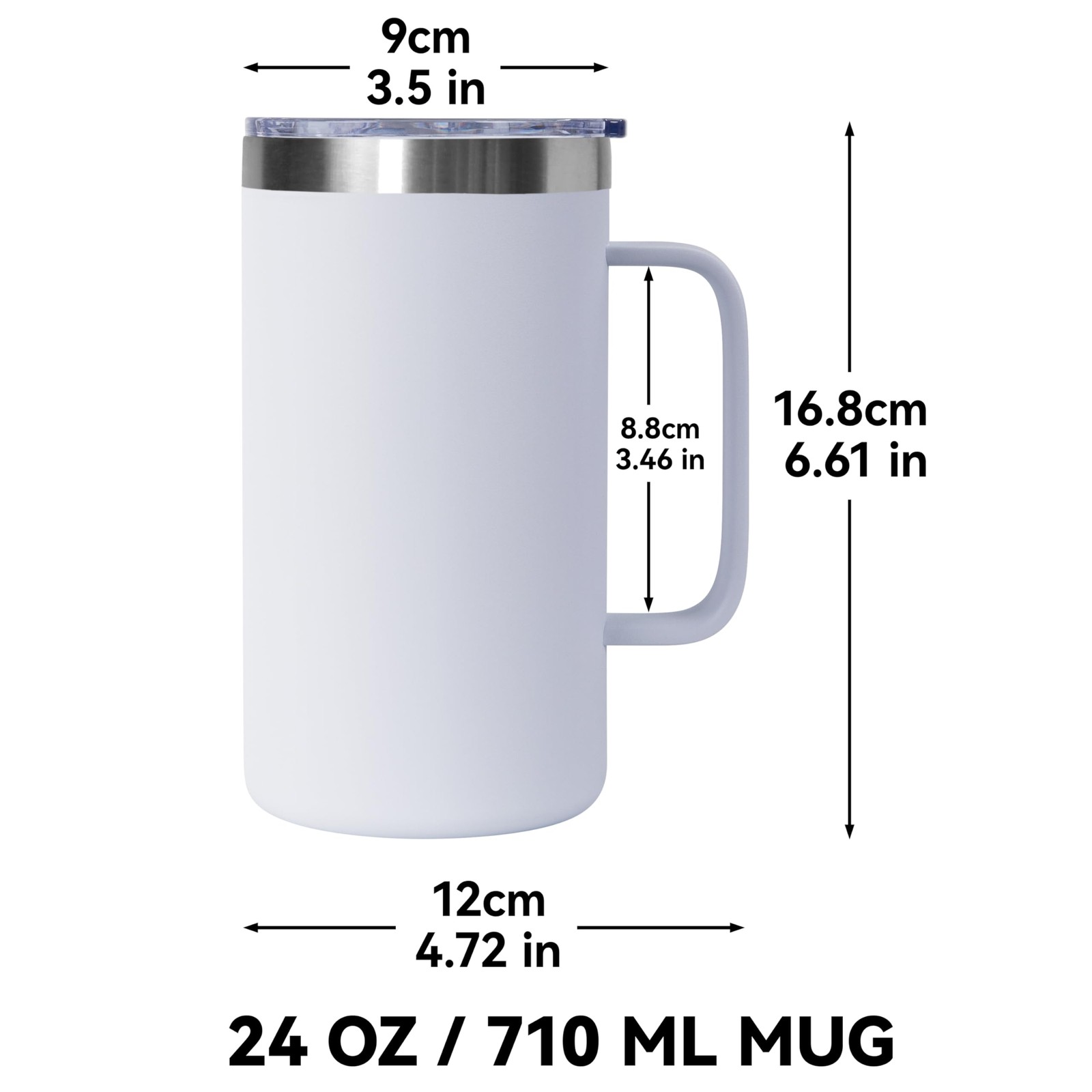 24oz Mug with Handle and Lid, Stainless Steel Coffee Mug, Reusable Insulated Cup, Travel Mug with Handle, Double Wall Vacuum Coffee Tumbler, Camping Gift for Men and Women 24oz Insulated Coffee Mug with Handle: This insulated 24oz mug with handle is made of high quality stainless steel, double-wall vacuum insulation, keeps your drinks at the perfect temperature for hours, whether it's piping hot or refreshingly cold. Premium Non-slip Wide Handle: Comfortable wide handle is designed to fit most people's hands, making it easier for your hands to grab and hold it away from you, with a more even force, so you don't have to struggle to lift a full cup of beverage. Leak-proof: This 24oz mug features a slide lid design that has been extensively market-tested, ensuring effortless usability and leak-proof seal, make sure you don't make a mess even when you're on the go. Powder Coating: Unleashing your creativity, the 24oz mug presents a powder coating process, empowering you to personalize the cup with laser engraving of your want, DIY your own unique mug! Widely Used: This insulated tumbler is designed for daily use as a travel coffee mug or water cup! Suitable for home, travel, office, lounge, bar, restaurant and many other occasions. Let you enjoy your favorite drink anywhere. It can be perfect gift for Birthday, Mother's Day, Father's Day, Thanksgiving Day, Christmas.