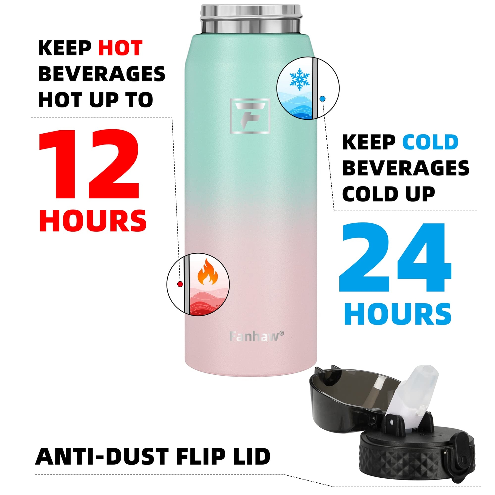 provides a 1-year . If you're unsure how to us, please refer to the video in the image. insulated water bottles are dishwasher safe, except for the lid. Please hand wash the lid. The straw lids feature a dust-prevent cover to keep the straw clean. The bottles are crafted from 18/8 stainless steel, while the lids are constructed from PP. Both materials are food-, BPA-free, and lead-free. Double wall insulation ensures beverages stay cold for up to 24 hours.