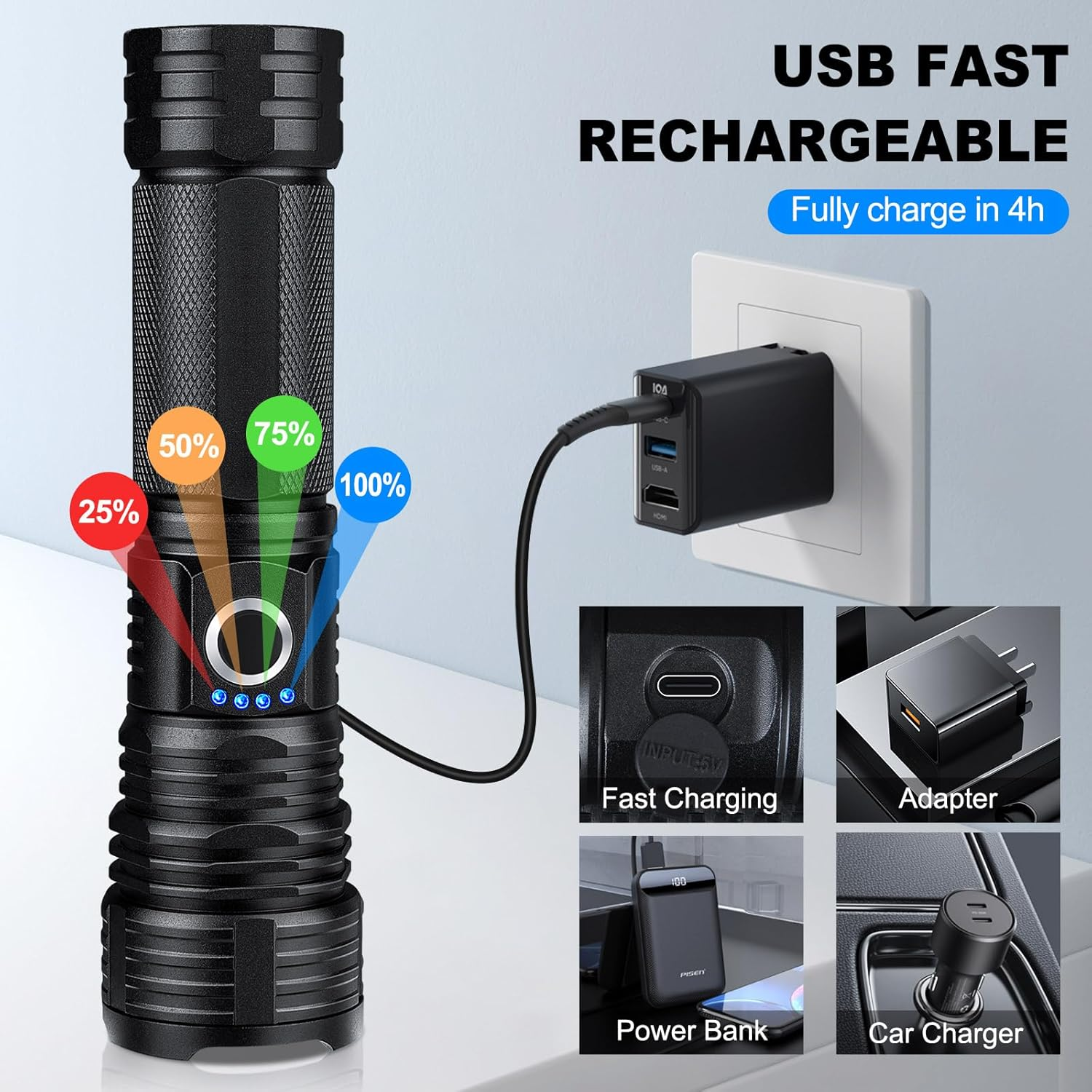 [990000 Lumen Super Bright Flashlight] GDPLUS 2 pack 990000 lumens rechargeable flashlights equipped with the upgraded LED wick, lights up to 30 times brighter than ordinary LED flashlight, easily illuminate a 200 ㎡ space or 3280ft distance, ensures that you can see far and wide. This high power flashlight's various lighting needs can be met, such as camping, hiking, and emerge∩cies. [USB Rechargeable | Multiple Charging Methods] The handheld flashlight has a fast USB input port and is suitable for charging docks, car charger, or power bank, which increases the charging speed by 30%, and fully charges only 4 hours. [Long Runtime | Power Display] The high lumen rechargeable flashlight is powered by a large rechargeable ΒATTERY for 12h on low mode, and the LED flashlights also come with power indicators, don't need to worry about suddenly running out of power while in use. [5 Light Modes | Adjustable] The powerful flashlight offers an impressive five light modes(High-Medium-Low-Strobe-SOS), hold down the button for 2 seconds in any mode to turn the flashlight off. Moreover, the powerful flashlight beam can be adjusted between wide-area illumination and remote illumination. [IPX6 Waterproof] This waterproof flashlight's compact structure, the waterproof rubber ring at the back cover improves the tightness and can be used in extreme weather such as wet, snow, and wind. However, please do not immerse this camping flashlight directly in water for a long time or discard the dust cover of the charging port, as these may damage the flashlight. [Quality material | Widely Use] The high lumens flashlight is made of aviation-grade aluminum alloy material, can withstand a 6-inch drop, shockproof and drop-proof, the handle has non-slip stripes and a lanyard for comfortable and convenient carrying. High quality rechargeable flashlight is perfect for indoor and outdoor use, such as hiking, patrol, and power failure. [Buy With Confidence] The LED flashlight is registered under the brand name GDPLUS, which means that you can trust its product quality and customer service. We offer a 2-year warranty and 24-hour customer service, providing 100% satisfaction service. Product Description Illuminate Your World with Our Premium Flashlights! At GDPLUS, we are dedicated to providing you with the highest quality flashlights that combine innovation, durability, and performance. Our flashlights are crafted with precision and care, ensuring that they can withstand even the toughest conditions. Choose GDPLUS flashlights and experience the difference for yourself. Illuminate your world and never be left in the dark again! GDPLUS SUPER BAIGHT FLASHLIGHT Illuminate Your World with Our Premium Flashlights! With an astonishing 990000 lumens of brightness and a remarkable 3280ft irradiation distance, our flashlights are truly a force to be reckoned with. Whether you're camping in the wilderness, working on a construction site, or simply need a reliable light source in an emergency, our flashlights will light up your way. What you will get: 2*Rechargeable LED Flashlight 2*Rechargeable ΒATTERY 2*USB Charging Cable 2*Lanyard 1*User Manual 1*Gift Case RECHARGEABLE FLASHLIGHT WITH POWER DISPLAY IPX6 WATERPROOF & 5 LIGHTING MODES ADJUSTABLE FUNCTION - PULL/PUSH THE FLASHLIGHT HEAD TO SWITCH THE BEAM YOU NEED
