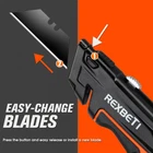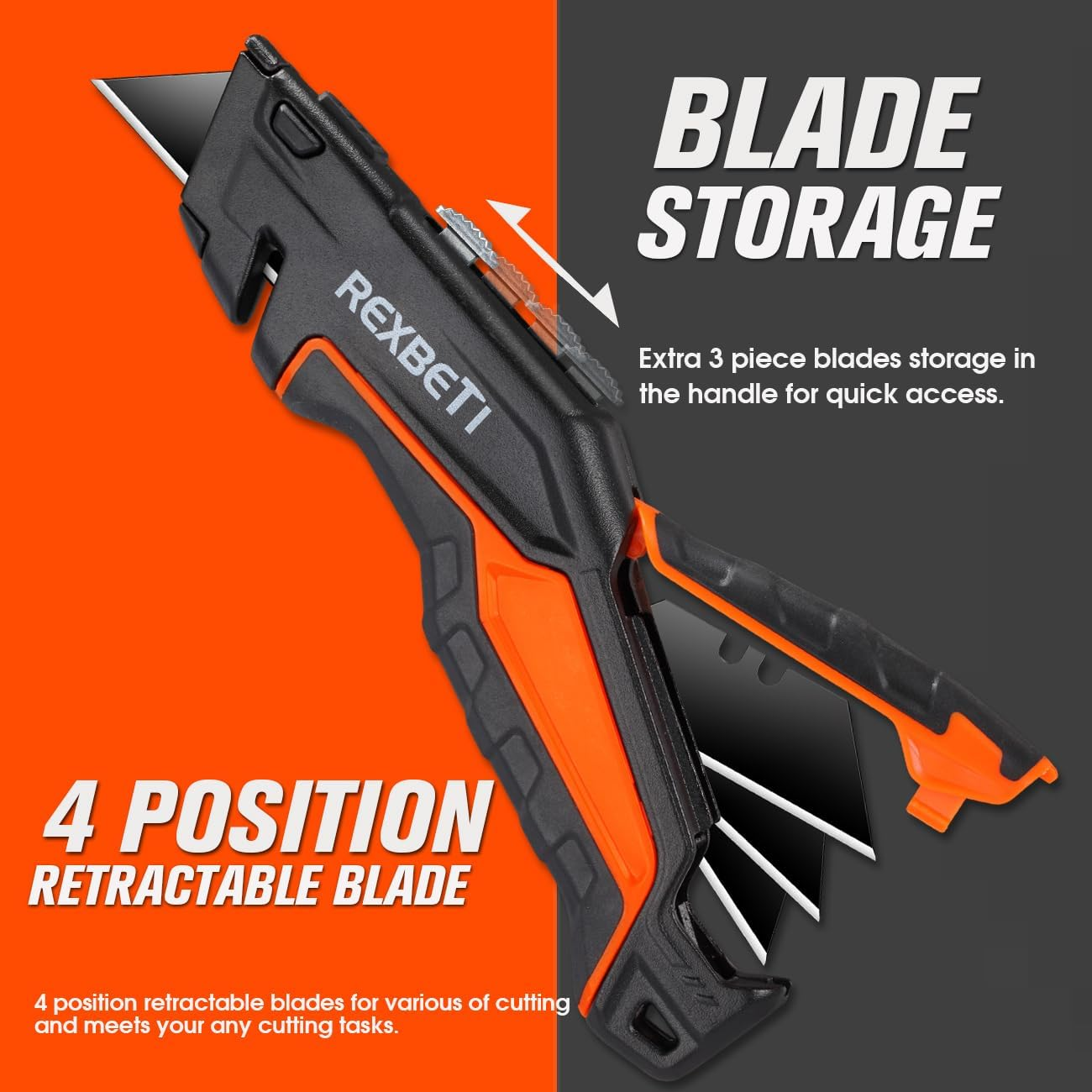 Ultra sharpness and double hardness blade, Perfect for hobby, DIY projects, cardboard, carpet, Rope,boxes, wallpapers, vinyl, rubber, leather, PVC material and etc Comes with 2-pack utility knife, retractable design and folding design. Ergonomical and rubbery handle offers strong grip all the time Blade storage design for easy and quick access. Extra 3 blades storage in the handle Extra 10-piece blades included. Made from high strength blackened SK5 steel for superior durability and long-lasting sharpness. 5X sharper and durable than normal silver blades. Rust-resistant design for longevity and reliability. Quick-change blade mechanism Product Description Attention: We recommend that you wear goggles when using. Although the utility knife is very common in daily life, but we still suggest to use them carefully. If you cannot release the blade, reconfirm whether to press the release button. We recommend to be patient when replacing the blade. Before use, please make sure that the blade is stuck in the slot. If it is not stuck in place, the blade will slip out. Never Allow Children To Use The Utility Knife Alone. REXBETI 2-pack utility knives can be the integral tool in your desk, office due to their versatility. the high hardness blade is ready for heavy duty use like home, art crafts, cutting boxes, cartons, DIY projects and most particular cutting tasks. The retractable design box cutter has 4 position retractable blade for various of cuttings and can meets your any cutting tasks. The folding design box cutter can fold in 3 angles. Both of these 2-pack utility knife are heavy duty design. The ergonomical rubbery handle offers perfect grip all the time. Sharp All The Time Unlike most cheap box cutters, REXBETI 2-pack utility knife are equipped with ultra sharpness and double hardness blade. Adventage:good hardness, not easy to break, good stability, good hardness and more powerful to cut like paper, tape, plastic, cardboard, photos, coupons, cardstock, mat board, foam board, fabrics, crafts or post office packages Perfect Grip A utility knife is an essential tool that everyone should have at hand at all times. Thanks to the ergonomical design, the strong grip will gives you more confidence when doing cutting tasks. The heavy duty anti-drop shell are made of hard plastic, you have no worry that it may be fragile like normal cheap box cutters. Smart Design Yes, you will get 2-pack utility knife. One with retractable design and another one with folding design. you can easily change the length of the blade or the angle that you want. Extra 3-piece blades are storage in the handle for quick and easy access when you need to change the dull blade.