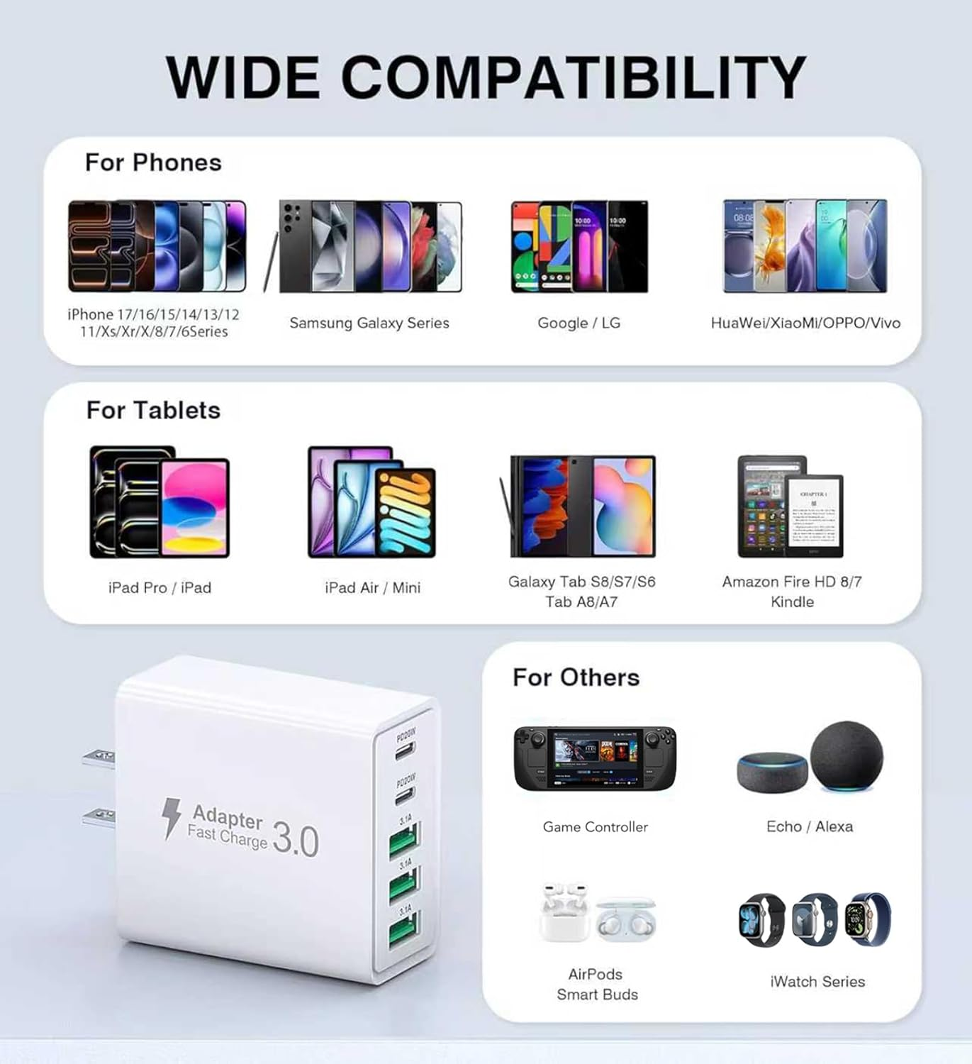 Store New Arrivals Add to Favorite View Feedback Contact Fast deliveries to the customer's home Quality customer service John Make the customers happy! [2-Pack] USB C Wall Charger,60W 5-Port PD Fast USB C Charging Block,2Usb C+3USB a Multiport Plug,Type C Power Adapter Brick Cube for Iphone 17/16/15/14/13/12/Pro Max/Xs,Ipad,For Switch,Samsung,Ultra 2 Description 2-Pack Charging Block:Multiport wall charger has 2 USB-C ports and 3 USB-A ports.It can charge multiple devices at the same time, including cell phones, tablets,, mobile power and headphones and game consoles, etc., and it minimizes waiting time. It minimizes waiting time and saves you a lot of space, making your desktop more tidy 60W Fast USB C Charger:This fast wall charging plug has a maximum output of 60W, which can fully charge your devices faster compared to ordinary plugs, greatly reducing your waiting time. Let you enjoy super fast charging, bring faster and more efficient charging experience for all devices Wide Compatibility: This type c wall charger is compatible with 17/17 Pro/17 Pro Max/17 Air/16/16 Pro/16 Plus/16 Pro Max iPhone 15/15 Pro/15 Pro Max/14/13/12/11/SE3/XR/XS Max/X/8 Plus, iPad Air/Pro/Mini, AirPods Pro, Samsung Galaxy S23/S22/S21/ S20 Ultra/S10/S9/S8 Plus, Tablet, LG, Motorola, PC Tablet, Google Nexus Tablet, Samsung Galaxy Tab AirPods 4/Apple Watch 10,Ultra 2 and other digital devices Compact and Portable Design:Extremely small and portable size can be easily put into your pocket or bag, will not take up too much space, perfect for all kinds of office, home, also great for portable outing traveling Safe and Reliable USB Plug:The 60W USB fast charger station has a built-in smart chip with GaN technology that automatically matches the current required by your device, preventing it from short-circuiting, over-current, over-voltage, overheating and over-charging. Meanwhile, the USB charger block is made of ABS + PC fire-resistant material, ensuring that your digital devices are always safely charged 24 hours a day Product description 1 Quick Charger 3.0 2 3X Fast Charging 3 Safety & Protection iPhones iPhone 17/17 Pro/17 Pro Max/17 Air,iPhone 16/16 Pro/16 Pro Max/16 Plus,iPhone 15/15 Pro/ 15 Pro Max/15 Plus, iPhone 14/14 Plus/14 Pro/14 Pro Max, iPhone 13/13 Mini/13 Pro/13 Pro Max, iPhone12/12 Mini/12 Pro/12 Pro Max, iPhone 11/11 Pro/11 Pro Max, iPhone SE 1/2, iPhone X/XR/XS/XS Max, iPhone 8/8 Plus, iPhone 7/7 Plus, iPhone 6/6S/6S Plus Other Accessories Wireless Chargers, Wireless Earbuds, Smartwatch, Switch ,AirPods 4,Apple Watch 10,/Ultra 2 and more USB C devices Android Phones Moto G82, Moto E32, Moto G Stylus(2022), Moto Tab G70, Moto G71 5G, G41, G40 Fusion G31, G Power(2022), G51, G51 5G, G50 5G, G60s, G20, G100, E30, E40, E20, E7i Power, E7 PowerEdge S30, X30, G200 5G, Edge (2021), 20 Fusion, 20 Pro, 20, 20 Lite, Google Pixel 5/4XL/4/3XL/3/2XL/2/XL, Nexus 5X/ 6P, Sony XZ2 Premium/Sony XZ3/Moto edge S30/X30/S Series/HUAWEI Mate/P/Nova Seriesand more Apple Accessories AirPods 1/2/3/4/Pro/Max, MagSafe Charger, Apple Watch Series Ultra2/Ultra/SE2/SE/10/9/8/7/6/5/4/3/2/1/iPod touch 5/6/7, iPod nano 7 Samsungs Samsung Galaxy S25/S25+/S25 Ultra/S24/S24+/S24 Ultra/S23 Ultra/S23+/S22 Ultra/S22+/S22/S21 FE/S21 Ultra/S21+/S21/S20 Ultra/S20+/S20 FE/S20 Lite/S20/Note 20/Note 20 Ultra/Note10+/S10/S10e/S10+/S9/S9+/S8/S8+/Note 9/Note 8/A73/A72/A53/A52/A33/A32/A03 and more Series Tablets Samsung Tab A8/A7/S8+/S8/S7+/S7/S7 FE/S6/S5/S5e/S4/S3; Lenovo Tab M10 / P10 / M8 / V7 / E10 / E7, Google Pixel Slate 12.3'', Fire HD 10/ Fire HD 8/ Fire, Kindle etc.Samsung Tab A / 4 / S6 / S5 / S5e / S4 / S3; Lenovo Tab M10 / P10 / M8 / V7 / E10 / E7, Google Pixel Slate 12.3'', Fire HD 10/ Fire HD 8/ Fire, Kindle etc. iPads iPad Pro 12.9" 1/2/3/4/5/6, iPad Pro 11" 1/2/3/4, iPad Pro 10.5"/9.7", iPad Air 1/2/3/4/5, iPad Mini 1/2/3/4/5/6, iPad 4/5/6/7/8/9/10 Specification Input: 100-240V, 50/60Hz 0.8A Output USB-C1/C2 : 5V=3A, 9V=2.22A, 12V=1.67A ,USB-A1/A2/A3 : 5V=3Ax3 Max Clean and Tidy One charging block for all your devices Compact and Portable Easy to carry, perfect partner for traveling Safe and Secure Intelligent protection, sleep peacefully Which series do you like? Add to Cart Add to Cart Add to Cart Add to Cart Add to Cart Add to Cart Add to Cart Customer Reviews 4.6 out of 5 stars 8,753 4.6 out of 5 stars 32 4.8 out of 5 stars 28 4.6 out of 5 stars 8,753 4.6 out of 5 stars 451 4.6 out of 5 stars 8,753 4.6 out of 5 stars 8,753 Price $19.99 $ 19 . 99 $19.99 $ 19 . 99 $14.99 $ 14 . 99 $27.99 $ 27 . 99 $18.99 $ 18 . 99 $29.99 $ 29 . 99 $21.99 $ 21 . 99 Charging Ports 2*USB C + 2*USB A 2*USB C + 3*USB A 2*USB C + 2*USB A 2*USB C + 2*USB A 5*USB A 2*USB C + 2*USB A 2*USB C + 2*USB A iPhone Fast Charging ✔ ✔ ✔ ✔ ✔ ✔ ✔ Samsung Fast Charging ✔ ✔ ✔ ✔ ✔ ✔ ✔ Max Power 40W 60W 40W 140W 50W 140W 40W Including Cable No cable No cable One cable No cable No cable No cable No cable Package Quantity 2-PACK 2-PACK 1-PACK 1-PACK 2-PACK 1-PACK 2-PACK Item model number HNT-PD415 Whats in the box User Manual Total USB Ports 5 Connectivity technologies USB Color 2 PACK White Amperage 3 Amps Product Dimensions 3.94 x 3.15 x 1.57 inches Connector Type USB Type A, USB Type C Other display features Wireless Compatible Devices Cellphones, Tablets, Laptops, Smartwatches Item Weight 4.2 ounces Input Voltage 240 Volts Special features Fast Charging, Lightweight Design Special Feature Fast Charging, Lightweight Design Compatible Phone Models function(f) {var _np=(window.P._namespace("DetailPageProductOverviewTemplatesJava"));if(_np.guardFatal){_np.guardFatal(f)(_np);}else{f(_np);}}(function(P) { P.when('A').execute(function(A){ A.on('a:truncate:po-attribute-truncate-3:updated', function(data) { var isTruncated = !data.truncateInstance.getIfTextFits(); var seeMoreElement = document.getElementById('po-attribute-see-more-id-3'); if(seeMoreElement) { seeMoreElement.style.display = isTruncated ? '' : 'none'; } }) }); })); Phone 17/17 Pr