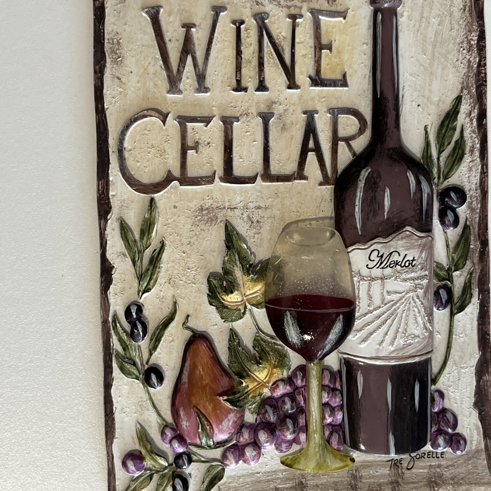 2pc 3D The Rustic Wine™ Vino & Wine Cellar Wall Plaques - Approximately 6.25" Tall x 3.5" Wide This pair is pre-owned and shows some wear, such as rust on one metal hanging piece on back, but there is much life left to live. They will add ambience to a kitchen, wine room, den and more. Please review all pictures carefully as they are part of the descrption. Questions are welcome.