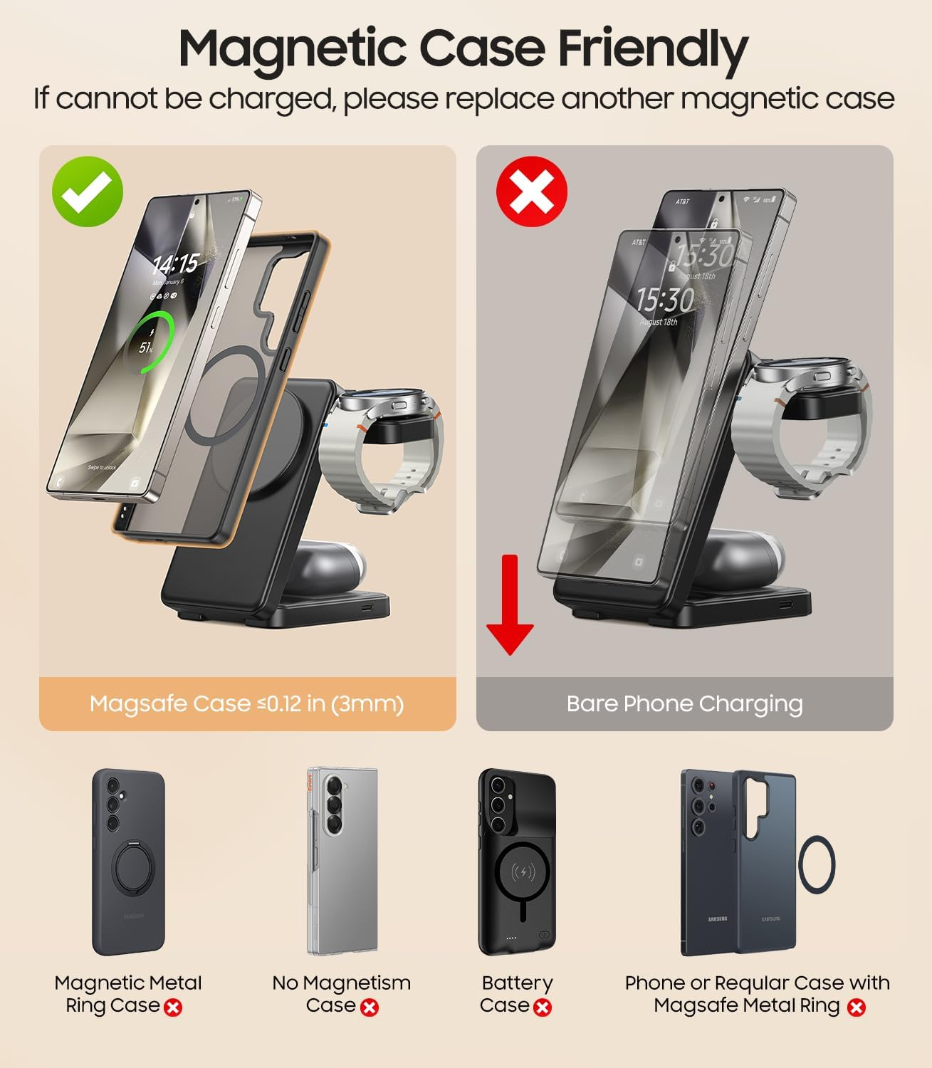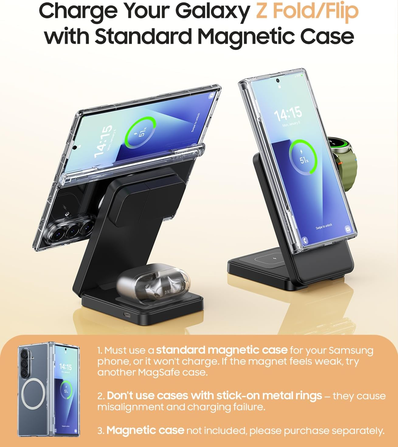 Store New Arrivals Add to Favorite View Feedback Contact Fast deliveries to the customer's home Quality customer service John Make the customers happy! 3 in 1 Magnetic Foldable Wireless Charger for Samsung, Fast Mag-Safe Charging Station for Galaxy S25 S24 S23 Ultra Plus/Z Fold/Z Flip 7/6/5, Charger Stand for Galaxy Watch Ultra /8/7/6/5/Pro, for Buds Description Magnetic Charging for Samsung Galaxy Phones: The cell phone charging area of this 3 in 1 wireless charger supports magnetic charging. Since Samsung phones do not support magnetic charging on their own, please use a magnetic case for charging your Samsung phone with our magnetic wireless charger. Don’t recommend using the following types of magnetic cases with our charger: 1. The magnetic case with a thickness ≥3mm; 2. Magnetic cases with a ring stand or metal ring on the back; 3. Magnetic wallet cases; 4. Magnetic battery cases; 5. Non-magnetic cases with a metal magnetic ring attached to the back.(Note: If your Samsung phone is not charging, please place another magnetic case.) 3 in 1 Fast Charger Stand:Our Mag Safe Wireless Charger is designed for Samsung devices. 3W Max for Galaxy Watch 8/Watch 8 Classic; Watch Ultra; Watch7; Watch6 Classic/6; Watch5 Pro/5; Watch4/4 Classic; Watch3(Not for Galaxy Watch (2018), GalaxyGear 1/2/live/S/S3/S2/S4/Sport; Galaxy Gear Fit/2/3/Fit e; Watch Active/2); 15W Max for Galaxy S25 Ultra/S25 Plus/S25/ S24 Ultra/S24 Plus/S24/S23 Ultra/S23 Plus/S23 /S22 Ultra/S22 Plus/S22/S21 Ultra/S21 Plus/S21; Galaxy Z Fold/Z Filp 7-1 series; Galaxy 20-S9 series; Galaxy Note 20-8 series and other phones that support qi charging; 5W Max for Buds. (For iPhone 12-16 series, it supports magnetic charging with the phone alone or with magnetic case) Foldable, Compact, and Portable: This 3 in 1 wireless charging station doubles as a wireless charger pad and easily folds for convenient portability. When fully folded, it's even smaller than the Samsung S24 Ultra—compact and lightweight, making it perfect for on-the-go use. Say goodbye to tangled wires and extra chargers. It’s the ideal choice for travel or business trips Rotatable Watch Charging Stand: This 3 in 1 charger stand compatible with magsafe has a rotational designed for the Samsung Galaxy watch charging stand. The watch charging position is upgraded to two charging methods: vertical charging and horizontal charging. It can be rotated by 55°to achieve the horizontal charging. With this new function, you can rotate the watch charging stand according to your needs to get the best charging experience Powerful Magnets & 15W Fast Charging Speed: Our magnetic charging stand is equipped with high-quality magnets that provide a strong attraction and keep your device in the ideal position for efficient and stable charging. The magnets also lock automatically for added ease of use. For the best charging experience, we recommend using the included QC 18W adapter and charging cable—carefully matched for optimal performance. Using third-party chargers may affect charging speed or stability Perfect Present & Professional Service: You will get: 3-in-1 Magnetic Wireless Charger Stand*1, QC 18W Adapter*1,USB A-C Charging Cable*1, User Manual*1. Our 3-in-1 magnetic wireless charger is the perfect present for yourself, loved ones, or friends. Our product comes with an 18-month after-sales service. If you have any questions or concerns, please feel free to contact us via the Amazon message center Product description 3 in 1 Magnetic Wireless Charger for Samsung Galaxy Devices 1 Strong Magnetism 2 With QC Adapter and Cable Tips: 1. Please use a magnetic/mag safe case to charge your Samsung Galaxy Phones 2. If can not be charged, please replace another magnetic case(magnetic case≦1.2in✔) 3. Only for Galaxy Watch 8/8 Classic; Galaxy Watch Ultra; Galaxy Watch 7; Galaxy Watch 6 Classic/6/5 Pro/5/4/4 Classic Item model number M8A Number of Items 1 Color Black Wattage 15 watts Connector Type USB A- USB C Compatible Devices function(f) {var _np=(window.P._namespace("DetailPageProductOverviewTemplatesJava"));if(_np.guardFatal){_np.guardFatal(f)(_np);}else{f(_np);}}(function(P) { P.when('A').execute(function(A){ A.on('a:truncate:po-attribute-truncate-2:updated', function(data) { var isTruncated = !data.truncateInstance.getIfTextFits(); var seeMoreElement = document.getElementById('po-attribute-see-more-id-2'); if(seeMoreElement) { seeMoreElement.style.display = isTruncated ? '' : 'none'; } }) }); })); 【ONLY for Samsung Galaxy Watches】Galaxy Watch8, Galaxy Watch8 Classic; Galaxy Watch Ultra; Galaxy Watch7; Galaxy Watch6 Classic, Galaxy Watch6; Galaxy Watch5 Pro, Galaxy Watch5; Galaxy Watch4, Galaxy Watch4 Classic; Galaxy Watch3(Not compatible with Galaxy Watch (Released in 2018), GalaxyGear 1/2/live/S/S3/S2/S4/Sport; Galaxy Gear Fit/2/3/Fit e; Galaxy Watch Active/2); 【Samsung Galaxy Buds】Galaxy 3/3 Pro; Galaxy Buds/2/2 Pro; Galaxy Buds Pro/Live & other supports wireless charging Buds See more Item Weight 12.6 ounces Input Voltage 9 Volts Compatible Phone Models function(f) {var _np=(window.P._namespace("DetailPageProductOverviewTemplatesJava"));if(_np.guardFatal){_np.guardFatal(f)(_np);}else{f(_np);}}(function(P) { P.when('A').execute(function(A){ A.on('a:truncate:po-attribute-truncate-3:updated', function(data) { var isTruncated = !data.truncateInstance.getIfTextFits(); var seeMoreElement = document.getElementById('po-attribute-see-more-id-3'); if(seeMoreElement) { seeMoreElement.style.display = isTruncated ? '' : 'none'; } }) }); })); 【Using Magnetic Case to Charge your Samsung Galaxy Phones】Galaxy S25 Ultra/S25 Plus/S25/S25 Edge/S24 Ultra/S24 Plus/S24/S23 Ultra/ S23 Plus/S23 /S22 Ultra/ S22 Plus/S22/S21 Ultra/ S21 Plus/S21/ S20 Ultra/S20 Plus/S20; Galaxy Z Fold /Z Filp 7/6/ 5/4/3/2/1; Galaxy S10/S10e/S10+/S9/S9+; Galaxy Note20/10/9/8; 【iPhone】 iPhone 16e/16/16 Pro/16 Plus/16 Pro Max/15/15 Pro/15 Plus/15 Pro Max/14/14 Pro/ 14 Pro Max/14 Plus/iphone 13/12/11(Pr