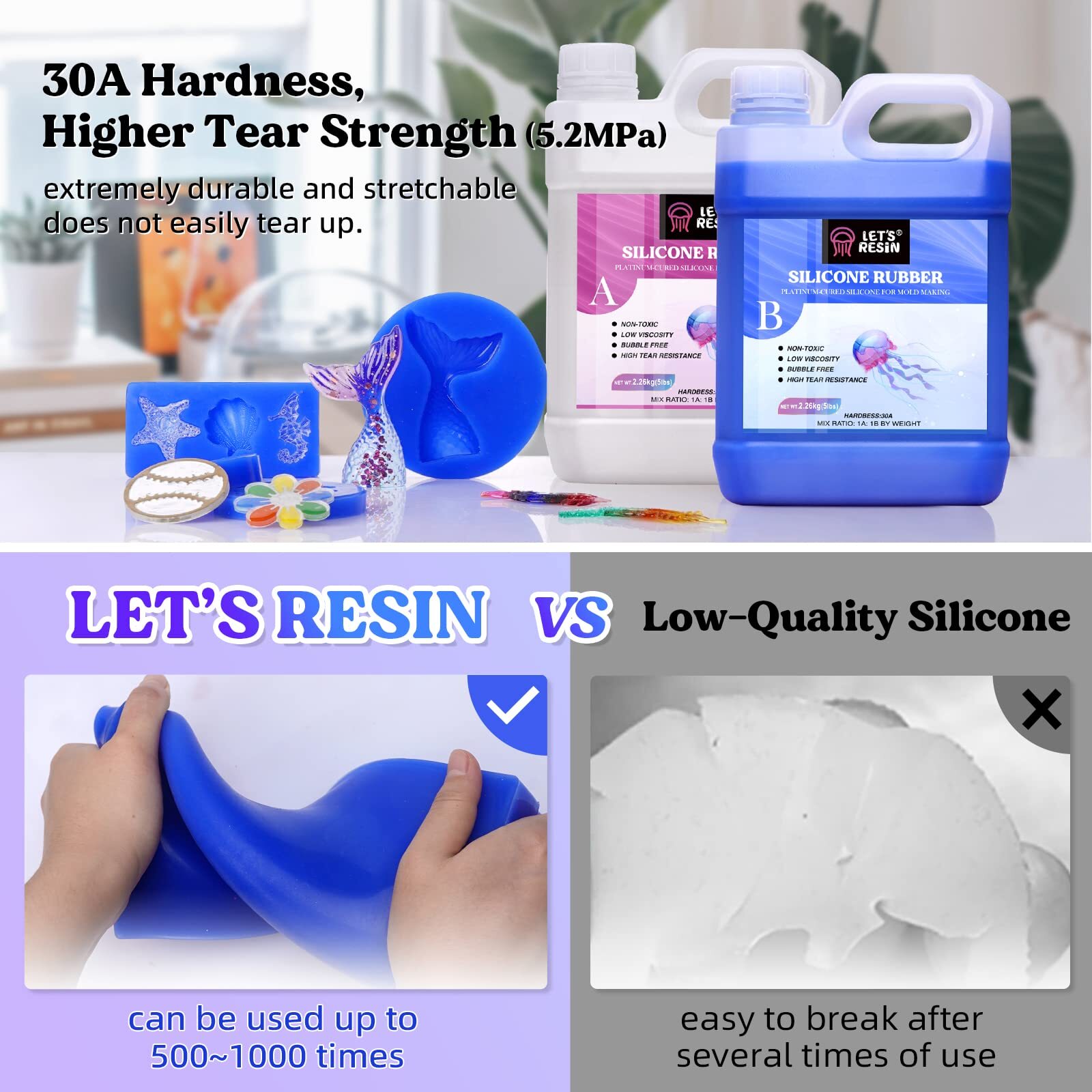 Silicone Mold Making Kit 30A,160oz/10Lbs Durable Mold Making Silicone Rubber, Fast Cure Platinum Cured Silicone, Self-Degassing Molding Silicone, Ideal for DIY Resin Molds & Silicone Molds 【Large Volume 160OZ/10LBS & Extremely Durable】: LETS RESIN silicone mold making kit comes with 2 bottles, each bottle containing 80oz/5lbs of platinum cure silicone, which is a very safe silicone material, non-toxic and odorless; the silicone mold finished with 30A silicone rubber has higher tear strength & resistance, not easily break, great silicone rubber mold making for simple one or two-part block molds 【 Self-degassing & No Bubbles】: No vacuum machine is necessary! The bubbles of liquid silicone will automatically disappear within 2 hours at room temperature due to its low viscosity feature. Bubbles tend to occur in hot temperatures. To reduce all bubbles, you can seal and store the mixed casting silicone in the refrigerator for 1 hour while curing, then continues to cure at room temperature 【Easy Mixing & Fast Cure】: mold making kit is designed with vibrant blue colors, you can easily see whether part A and part B mixed evenly thanks to the bicolor appearance; The mix ratio is 1:1 by weight. Just pour the equal Part A and Part B together, then stir the silicone mix for 3 minutes; the working time is within 30 minutes and the cure time is 3~ 6 hours at room temperature. The final curing time varies on various conditions 【Wide Application & Long Life Span】: high-performance silicone for mold making is very ideal for art craft use, easily make your own silicone molds, including resin molds, large silicone molds, 3D silicone molds, concrete molds, cement molds, soap molds, candle molds, plaster molds, clay molds, flower molds, rose mold,etc; The silicone molds have a very long life span, which can be used up to 500~1000 times.Ideal for silicone mold maker 【Tips for Mold Making 】: Cure inhibition is one of the most common issues that can occur during the making mold process. The platinum catalyst in the molding silicone can become deactivated by coming in contact with contaminants like UV RESIN,3D print resin, Sulfur-based clay, and Tin-cure silicone. We suggest you read the manual carefully before the operation and always make a small patch test first. Please feel free to contact us if there's any issue Package Include: Silicone Rubber-Part A(80oz/5lbs) x 1 Silicone Rubber-Part B(80oz/5lbs) x 1 Shipping We offer FREE shipping on all orders! We ship within Three business days of payment, usually sooner. We use a selection of shipping services such as UPS, FedEx, USPS etc. We only ship to the lower 48 states, no APO/FPO addresses or PO Boxes allowed. Local pickups and combined shipping options are not provided at this time. Return You can return a product for up to 30 days from the date you purchased it. Any product you return must be in the same condition you received it and in the original packaging. Please keep the receipt. Payment We accept payment by any of the following methods: PayPal Please pay as soon as possible after winning an auction, as that will allow us to post your item to you sooner! Feedback Customer satisfaction is very important to us. If you have any problem with your order, please contact us and we will do our best to make you satisfied. Contact Us If you have any queries, please contact us via ebay. We usually respond within 24 hours on weekdays. Please visit our eBay store to check out other items for sale! Thank you for shopping at our store.