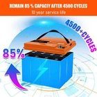 Features 【Automotive Grade Lithium Battery】 PFCTART lithium iron batteries have exceptional quality since they are manufactured by Automotive Grade LiFePO4 Cells with higher energy density, more stable performance & greater power. Highest-level safety based on UL Testing Certificate for the cell inside the battery.This makes li-iron batteries perfect for solar home, RV, campers,motor homes, off-grid applications. 【10 Years lifetime】PFCTART LiFePO4 battery provides 4500+ cycles, which is more than 10 times to Lead Acid with 300~600 cycles. PFCTART LiFePO4 battery has a 10-year service life, three times longer than the Lead Acid’s 3-year lifetime. 【95%* Efficiency】 PFCTART LiFePO4 battery’s flat discharge curve holds above 12.8V for up to 95%,of its capacity usage, providing astronomical boosts in run-time compared to only 50% in Lead Acid. This product is your best choice for outdoor camping power and indoor easy installation. 【1/3* Lightweight】 PFCTART LiFePO4 Battery weighs only 8.81 lbs for one module, only 1/3* the weight of lead acid batteries, which makes it an easy choice for RVs, Marine and Off-Grid Applications when mounting or mobility is in the consideration. 【100% Protection】 PFCTART LiFePO4 battery has built-in BMS (Battery Management System) to protect it from overcharge, over-discharge, over-current, and short circuit with excellent self-discharge rate. Built-in high-temp cut off prevents charging over 167 °F (75 °C). Without memory effect, no matter what state the battery is, it can be used as soon as it is charged. PFCTART LiFePO4 battery is IP65 level waterproof, which set you free from worrying to install indoors or outdoors. Specifications Battery type: LIFEPO4 MODEL: 30Ah 12.8V(4S5P) Rated capacity: 30Ah(384WH) Normal voltage: 12.8V Discharge termination voltage: 10.0V Charging voltage: 14.6V Internal resistance: ≤180mΩ Single cell: IFR 32700 3.2V 6000mAh Standard charging. Continuous current: 0.2C5A Continuous voltage: 14.6V Cut-off current: 0.01 C Standard discharge: Constant current 0.2C5A end voltage 10.0V Max. charging continuous current: 30A Maximum discharge continuous current: 30A Operating temperature range. Charge: 0~45℃ Discharge: -20~60℃ Product size: 177*167*125mm Weight : 4kg BMS Protection Cell overcharge detection voltage:3.90V±50mV Cell overcharge recovery voltage:3.80V±100mV Cell over-discharge detection voltage:2.00V±100mV Cell over-discharge recovery voltage:2.50V±100mV Rated operational charge current:30A Over current detection:60±5A PCM impedance:≤50mΩ Note It does not have series/parallel protocol, please do not use it for multiple series or parallel installations.