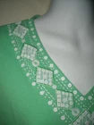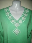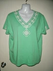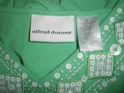 This is for a Alfred Dunner Blouse It is preowned , It has no rips, tears or stains. See pictures for actual condition. IT is made of cotton and polyester The shirt is light green. It is a stretch knit. IT has v neckline that is accented with white beads, and sequins. IT has short sleeves. It measures armpit to armpit laying flat is 22" It measures down the back 23". It is a size Medium Manufacturers sizing's due vary please check measurements. If you have any questions or problems - before or after. Please message me.