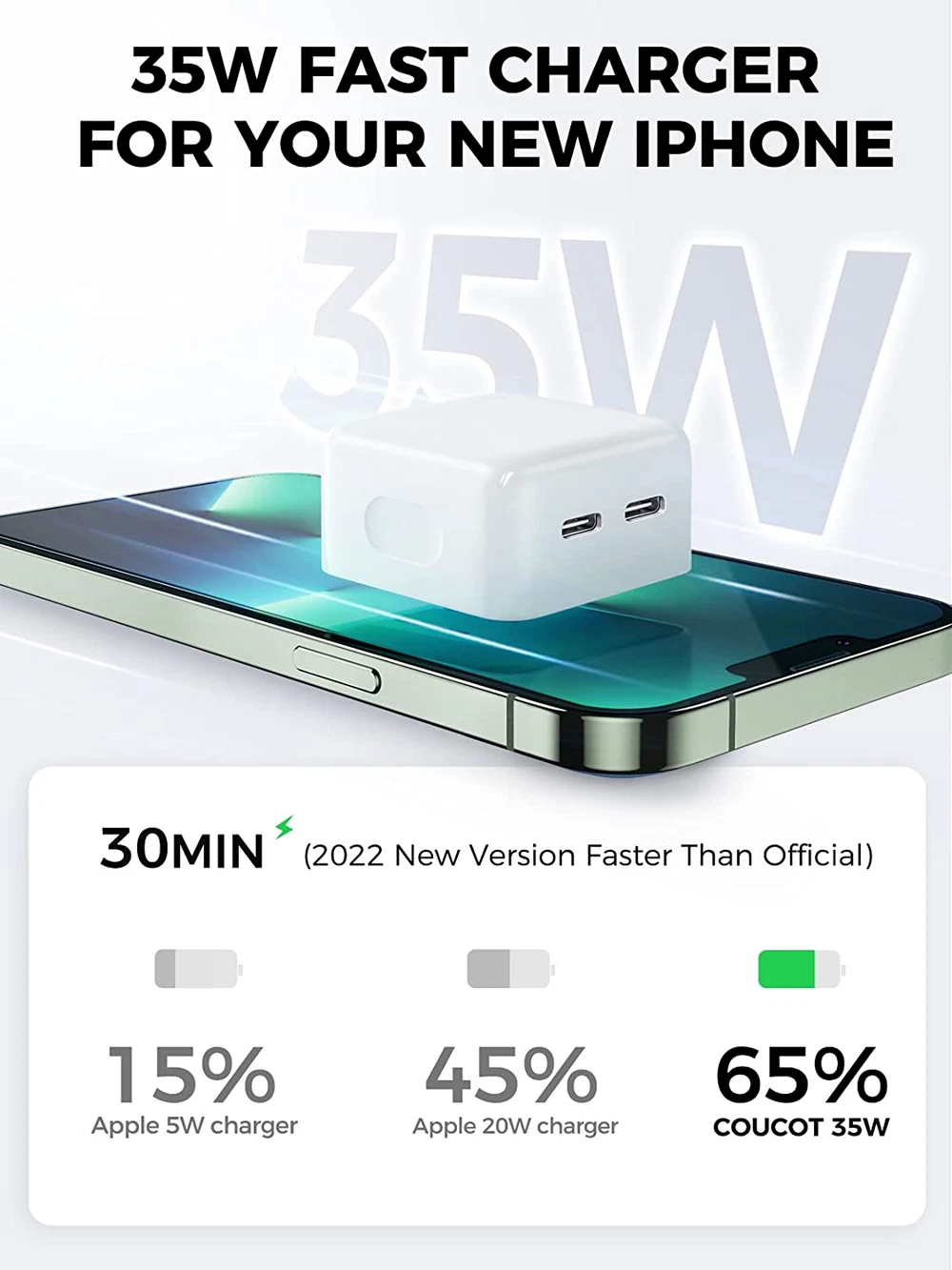 About this item: 【35W USB-C Port Charger Block】: PD 3.0 USB C Wall Charge Fast Charging Port with 25W Max Output: 5 times faster than 5V2A charger, can charge 14 Pro max from 0% to 60% more than 30 minutes and iPad Air 4 from 0% to 50%(Note: When both ports are charging at the same time, 35W is shared.) 【Dual Port Output】: With 2 Type C port, this iPhone charger block lets you charge two devices simultaneously, a much more efficient way to charge your iPhone, iPad or AirPods at the same time 【35W Charger Compatible】: This 35W iphone charger fast charging compatible with iPhone 16 Pro Max/16 pro/16/15/15 Pro/ 15 Pro Max/ 15 Plus/14/14 Pro/ 14 Pro Max/ 14 Plus/ 13 plus/ 13/13 Pro/ 13 Pro Max/ Max/ 14 pro/ 14 Pro Max/ 14 13 mini/ 12/ 12 Mini/ 12 Pro/ 12 Pro Max/ SE 2020/ SE 2022/11/ 11 Pro/ 11 Pro Max/ XS/ XS Max/ XR/ X 8/ 8 Plu/ 7/ 7 Plus/ 6/ 6 Plus/6S/6S Plus/5C/5S/5/SE、i-Pad、i-Pad Pro、i-Pad mini、i-Pad Air、i-Pod, Galaxy Note S22 S21 S20 Pad MacBook and most of phone tablet laptop and more devices 【 Charge protection 】: USB-C power adapter provides advanced intelligent circuit safety system to prevent short circuit, overheat, overcurrent, and overcharge. And the unique trickle charging mode, automatically activated when the power reaches 80%, to protect the health of the mobile phone battery Buyer Note: If you are satisfied with our service, we appreciate you leaving us a positive feedback and 5 star rating review! Your opinion is important to the success of our business. If you are not satisfied with the product or have not received the product for more than 35 days, please contact us to resolve, we will do our best to solve. We are sure to come up with a satisfactory solution. Please contact us first before leaving cold feedback or good feedback of 1-3 stars and opening the case. We'll do our best to solve your problem. Because we believe that everything can be solved through communication. Thank you very much!
