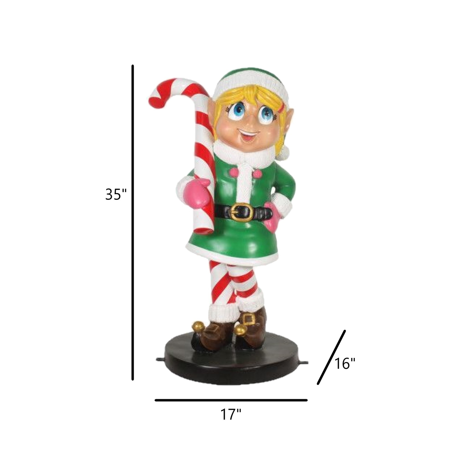 Garden Elements Fiberglass Elf Girl With Candy Cane Christmas Decor, 35in PRODUCT DESCRIPTION This cute elf girl is the perfect addition to your holiday display! Key Product Features Handcrafted design displays detailed craftmanship, with each exquisite detail captured Durable fiberglass construction is resistant to weathering, corrosion, and UV damage For indoor or outdoor use Dimensions (LxWxH): 17 in x 16 in x 35 in Lightweight design makes it easy to relocate and put in storage during the off season Welcome your guests with this charming statue. This welcoming elf will surely delight your visitors with its cheerful smile. Wearing her Christmas outfit, this statue will match your holiday setup! Standing at 35 inches, this elf-inspired fiberglass-made figurine will surely be the attention-grabbing decoration of your home. If kept outside, you will need to re-coat the clear protective coating every 12 to 18 months in order to preserve the appearance and integrity. This can be done with a good quality enamel clear gloss.