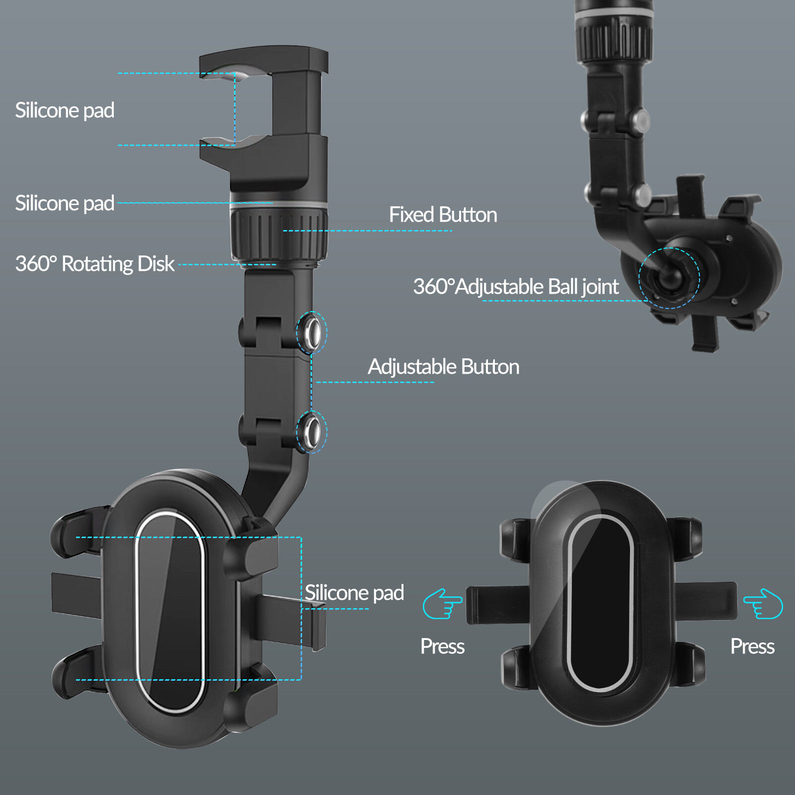 This car phone holder is a game-changer! The 360° rotation and adjustable arm make it super easy to find the perfect viewing angle. It clamps securely onto rearview mirrors or desk edges without slipping, and the stretchable grip fits various sizes. Perfect for navigation, hands-free calls, or even watching videos—super sturdy and convenient!