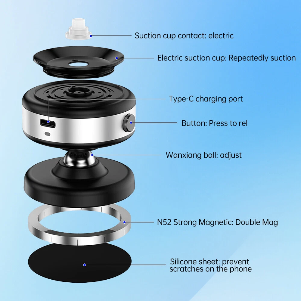 Features: 【Magnetic Suction Holder】Our Magnetic Car Suction Cup Holder features a ring-shaped metal panel with 32 N52 rubidium magnets, providing the highest magnetic strength in the industry. 【360 Degree Rotation】In order to provide a better viewing angle, the suction cup mount has a 360-degree swivel function that allows users to adjust the direction and angle of the phone. 【Easy to Install】The Magnetic Car Suction Cup Holder is designed to be easy to install. It features a suction cup that easily attaches to any smooth surface, such as a car window or dashboard, glass, smooth tiles, easy to install, no tools required. 【Universal Mobile Phone Holder】 The Phone Holder is universal and suitable for various brands and models of smartphones. The magnetic adsorption function of the mount makes it widely compatible, so users don't need to worry about whether their phones are suitable or not.