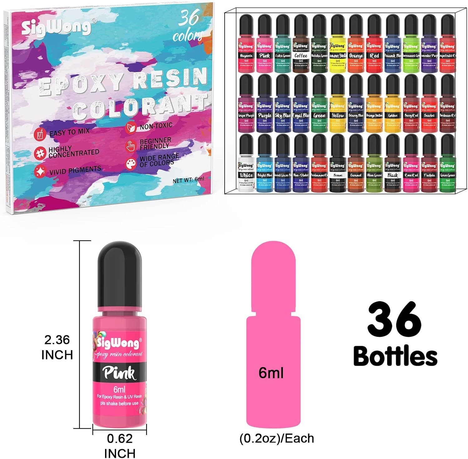 【STUNNING COLORS】: Total 36 beautiful translucent colors liquid epoxy pigment, Caramel, Grape Purple, Grapefruit Red, Lake Green, Peacock Blue, Starry Blue, Purple, White, Golden, Yellow, Black, Rose Red, Royal Blue, Fuchsia, Fluorescent Green, Green, Lemon Yellow, Red, Sky Blue, Coffee, Orange, Pink, Orange Yellow, Grass Green and more, each resin colorant 6ml/0.25oz. 【TRANSLUCENT LIQUID DYE】: The resin dye can mix well into resin, and these epoxy resin color pigments are very concentrated, just a little drop can go a long way! It also can mix with another epoxy colorant to achieve the desired color or mix the white color to achieve opacity. 【WIDE APPLICATION】: These resin pigments can be widely used on resin jewelry and crafts decorations, jewelry making, paint, garment accessories, or other DIY making. 【EASY TO USE】: These liquid resin dye are sealed in bottles. Beginner friendly and the experienced/veteran can enjoy it as well, the squeeze bottles make it easy to control your drops so that you can get the perfect shade every time.