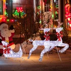 Product Description:- Introductions: This charming 3-Piece Lighted Set of 2 Reindeer & Sleigh is the perfect addition to your holiday décor. Featuring two reindeer pulling a santa's sleigh, this set is beautifully adorned with festive bowknots and sparkling glitter, capturing the magic of the holiday season. With its durable, weatherproof design and warm LED lights, it adds a cozy, enchanting glow to any indoor or outdoor space. Easy to assemble and store, this reindeer set will bring joy and festive cheer to your home year after year. Features: 1. Charming Reindeer & Sleigh Set: This delightful set features two reindeer pulling a santa's sleigh, each detailed with a festive bowknot and glistening glitter for added holiday sparkle. Loved by both kids and adults, this reindeer and sleigh set is sure to bring warmth and festive joy to your outdoor or indoor Christmas decorations. 2. Eye-Catching LED Lights: Pre-lit with 270 white LEDs, these reindeer glow beautifully in the night, creating an inviting holiday atmosphere. The well-placed LED lights make the reindeer a stunning focal point for your Christmas display, both day and night. 3. Weather-Resistant and Sturdy Build: Made from a durable, rustproof metal frame with waterproof fabric, the reindeer set is built to withstand wind, rain, and snow. The included ground stakes provide extra stability, ensuring your decorations stay secure in winter weather. 4. Easy Assembly & Storage: This collapsible reindeer set can be set up in minutes, allowing you to enjoy your festive display without hassle. The lights are pre-installed, simply connect the wires and plug them in to watch them come to life. 5.Perfect Holiday Decor for Indoor & Outdoor: Whether placed indoors near your Christmas tree, on the porch, or outdoors in the yard, this lighted reindeer set enhances any holiday setting. Perfect for holiday parties, weddings, or as a festive yard display, these reindeer bring elegance and a joyful touch to your celebrations. Specifications: 1. Overall Dimensions: (83 x 10.8 x 39.4) in / (211 x 27.5 x 100) cm 2. Number of Lights: 270pcs 3. Light Color: White Package Includes: 1 x 2 Reindeer & Sleigh Set 1 x Set of Ground Stakes