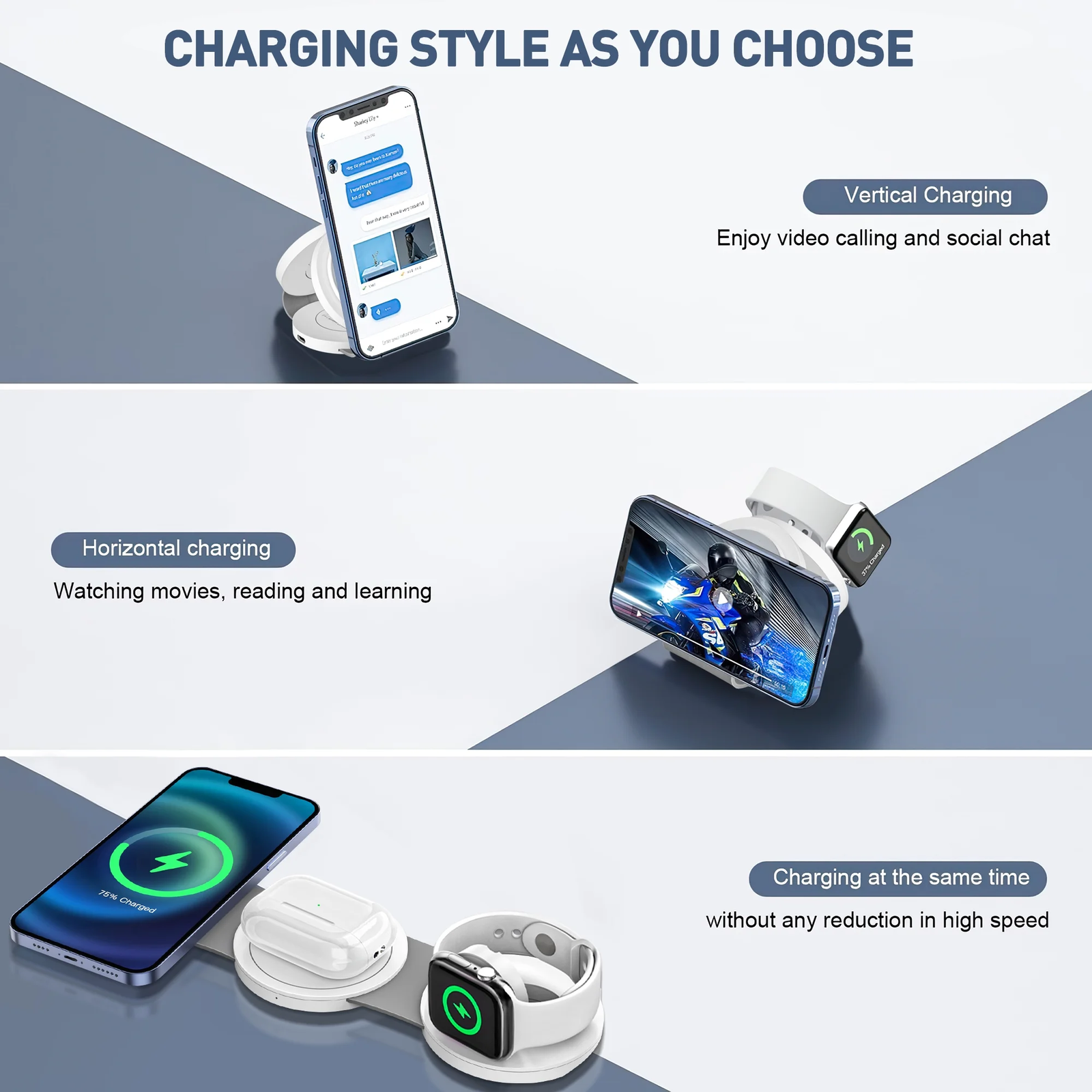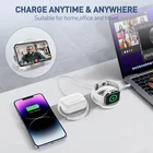 3 in 1 wireless charger iphone: This is a 3 in 1 charging station for apple devices, which can charge your Airpods, iPhone, and Apple Watch simultaneously. Compatible with iPhone 16 15 14 13 12 11 8 Pro Max Mini Plus X XR XS Max SE Plus, Apple Watch Series 10 9 8 7 6 5 4 3 2 SE, AirPods 2 3 pro pro 2 (Note: for Airpods 2 3, needs work with a wireless charging case ). It can also charge other phones with wireless charging capabilities Super Fast wireless iPhone Charger: This product features high-quality strong wireless that ensure easy alignment with the wireless charging coil of the smartphone and keep your phone and watch in place while chargingresulting in a fast and stable charging experience. Fast Wireless Charging Station: To ensure fast and safe charging without damaging the devices, it's essential to use 18W Quick Charger 3.0 (9V - 2A) fast power adapter and charging cable(power adapter is NOT included). It takes about 2-3 hours for a full charge. The phone charging output up to 7.5W, earbuds charging up to 3W, and watch charging up to 2.5W Safe Wireless Charging Base: This cell phone charging station features a upgraded coil design which incorporates overcurrent, overvoltage, over-heat protection, and foreign object detection. Thoughtful internal circuit design prevents overcharging and safeguards device battery health for a 3 in 1 wireless charger. Case-Friendly & Foldable Design: Our iPhone wireless charger supports cases with a thickness of ≤ 0.16 inches (4mm). Please avoid cases with metal rings, pockets. The iPhone charging station is foldable, lightweight, and portable, suitable for carrying in bags or suitcases. This wireless charging stand is not only great for home and office use but also for travel and trips. What is in the box: 1 x 3 in 1 Wireless Charger 1 x Fast TYPE-C Charging Cable 1 x Manual 🚀【3 in 1 Wireless Charging Station】 This charging station for Apple device uses a new copper alloy coil, which can increase the energy conversion rate by 50%. The Apple Charging Station can efficiently charge up to three devices simultaneously, with a maximum charging power of 15W for iPhone, 5W for AirPods and 2.5W for iWatch. The wireless charger is compatible with AirPods 2/3/pro; iPhone series 16/15/14/13/12; iWatch Ultra/10/9/8/7/SE/6/5/4/3/2. 🚀 【Foldable Wireless Charger】 3 in 1 Wireless magnetic charging station, which can be equipped with three foldable charging modes. This iPhone charging station has a built-in wireless design. Whether you are working, playing games, watching movies or listening to music, the wireless charging pad allows you to attach your iPhone to this charging station perfectly. 【All in One Wireless Charger】 Travel wireless charger for multiple devices has a foldable design that allows you to charge your watch, phone and AirPods at the same time. Lightweight and compact design is easy to organize and carry, ideal for communication, entertainment, office and travel. 🚀 【Magneitc Alignment & Strong Adsorption】 3 in 1 wireless chargers with strong magneitc and Built-in battery, high-quality wireless accurately determine the best position for wireless charging and ensure fast and stable wireless charging. Note:The iPhone wireless charger supports iPhone 16/15/14/13/12 models and the latest iPhone devices. It is recommended to not use a phone case or wear a case with a thickness of ≤ 2mm. 🚀【Smart Protection & Fast Charging 】 Our wireless iphone charger are all FCC certified and use multi-function smart shunt technology and built-in smart chip. With overcurrent, overvoltage, overheating and short circuit protection.Please use a QC 3.0 adapter (NOT included) and a Type-C fast charging cable for better and safer charging.