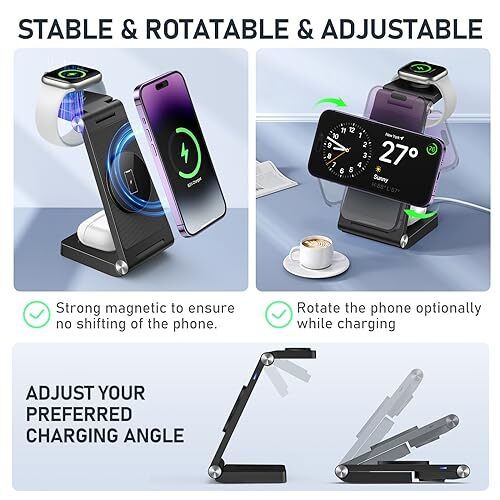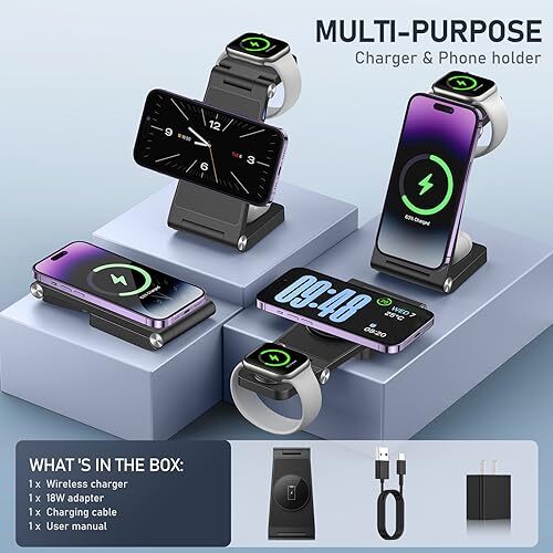 Return Policy Fast Delivery Trusted seller Magnetic Wireless Charger Stand, 3 in 1 Foldable Wireless Charging Station, Travel Charger for Multiple Devices for iPhone 15 14 13 12 Series, Apple Watch Ultra/SE/9/8/7/6/5/4/3/2, AirPods Product Description 【3 in 1 Foldable Wireless Charger】The charging station for multiple devices, support charging iPhone, iwatch, AirPods simultaneously. It suitable for all iPhone 12-15 series. Compact size, well built, fast charging, space saving, exactly what you need! (NOTE: Please take off your phone case when charging, or use a special magnetic charging mobile phone case.) 【Safer and Faster Mag-safe Charger】We use an upgraded coil with strong magnetic suction, easy to place in the right spot for charging. It is well made and charges your phone more efficiently without heat through a strong magnetic connection, compared with other non-mag-safe 3-in-1 chargers, the charging speed increased by 30%-35%. This compact wireless charger features multi-functional system smart chip technology that provides over-current protection, over-voltage protection, short-circuit protection,and foreign object detection. It adopts professional magnetic isolation sheet, no radiation, harmless to the elderly and children, dedicated to protecting the health of you and your family. 【Travel Essentials: Portable & Foldable】This 3 IN 1 charging station can be folded 180° into a wireless charging pad smoothly, small and not bulky, bring this 3in1 charger and put in a bag or suitcase when you are traveling or on a business trip, no extra cords, no separate chargers needed, what a minimalist & eco-friendly life! Gifts for people who travel for work OR international travelers. 【Adjustable Angle Phone Charging Station】3-Different Charging Ways options: Portrait Mode, Landscape Mode and Flat Mode, as well as folded into as a phone holder as you want, free your hands to enjoy watching movies and entertainment, save space wver you want it to sit without slip off. More importantly, this upgraded wireless iPhone charger with the raised coil design in the center, you don't need worry about intermittent charging caused by touching the top camera when charging vertically. 【Customer Service】Warmly Tips: (1) The magnetic attraction function is only for iPhone 12-15 and more advanced. (2) Not for Airpods 2 non-wireless version. (3) Not for Apple Watch 1 and other brands watch. We offer a 12-month warranty, if you have any questions, don't hesitate to contact us, please contact us at the first time to get a replacement or refund! Shipping Returns Payment Shipping Shipping is FREE to all addresses other than APO/PO boxes in the lower 48 states. All our stock ships from US-based warehouses. Shipped via USPS or UPS (depending on location and package weight) Unless stated otherwise, all orders will ship within 24-72 hours of your payment being processed. Check our feedback to see the great reviews of FAST shipping we offer. Returns Seller does not accept returns Payment We currently accept payment via eBay managed payments only. Once payment is cleared, we will dispatch your shipment within 1-3 business days. Please refer to the "Shipping" tab for more information regarding shipping speed to your destination.