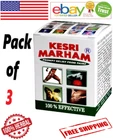 3x Kesri Marham Balm For Joint Pains, Headaches & Body Pain 100gm Each (Free Ship) Kesri Marham Balm is a balm designed with ayurvedic compounds that give relief from joint pain, body pain and headaches. It is manufactured with natural ingredients. It can be easily applied to the affected area to reduce the pain. Key Benefits: This marham can help in cases of pain like headache, joint and back pain This marham can be rubbed on the affected area to get relief from the pain Directions For Use: Use as directed on the label.