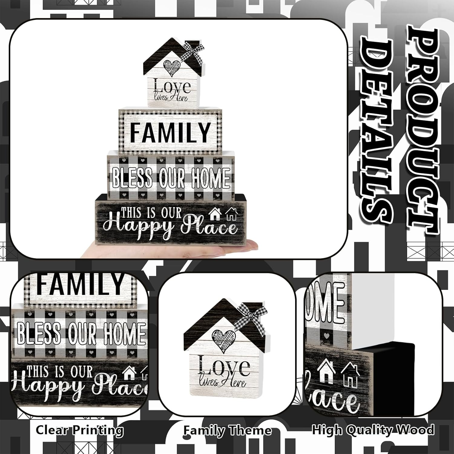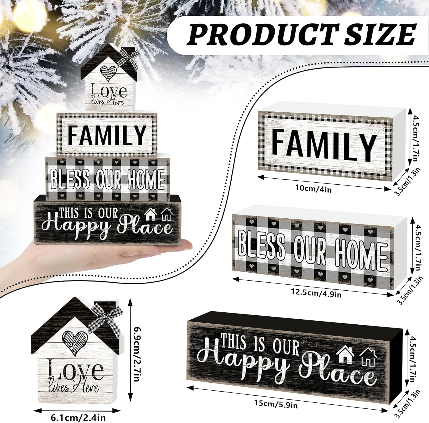 Store New Arrivals Add to Favorite View Feedback Contact 4 Pcs Farmhouse Family Wooden Tiered Tray Decor Set, Rustic Bless Our Home Wood Table Decor Buffalo Plaid Distressed Stack Block Signs Tabletop Centerpieces for Home Kitchen Shelf Mantle Decorations Description Item model number LQ2503315007 Style Family Mounting Type Tabletop Batteries required No Product Dimensions 6 x 1.3 x 5.1 inches Material Wood Shape Rectangular Item Weight 7.8 ounces Color Farmhouse Family Theme Family Brand TOMPOP Manufacturer TOMPOP Warm Rustic Family Vibes: This farmhouse-style decor set brings a cozy, nostalgic touch to your home with retro-inspired designs, rustic wood textures, and heartfelt words like “Family,” “Love,” and “Home.” Vintage-Inspired Faux Book Stack: Featuring a distressed wood finish and hand-painted lettering, these stacked book blocks evoke a charming, well-loved look that beautifully complements rustic, vintage, cottagecore, and country-style interiors. Ideal Size for Versatile Displays: Includes three wooden blocks (5.9” x 1.3” x 1.7”, 4.9” x 1.3” x 1.7”, and 4” x 1.3” x 1.7”), plus one small love home. Perfect for tiered trays, mantels, kitchen shelves, or entryway tables. Crafted with Quality & Care: Made from premium solid wood, this farmhouse block set boasts a sturdy construction and a beautifully hand-distressed finish. A timeless accent that celebrates the heart of your home all year round. Heartfelt Gift Idea: Whether for Mother's Day, a housewarming, a wedding, or just to show appreciation, this retro farmhouse block set makes a thoughtful gift that adds lasting warmth to any space. Add a touch of warmth and rustic charm to your home with this Farmhouse Retro Faux Book Stack, featuring heartfelt words like “Family,” “Love,” and “Home.” Inspired by the timeless beauty of country living, this decorative tabletop piece captures the essence of togetherness and simple joys. Crafted in a vintage stacked book design with distressed wood textures and hand-painted details, it brings nostalgic flair to any space. Whether styled on a tiered tray, coffee table, mantel, or kitchen shelf, it effortlessly enhances your home with cozy farmhouse character. Perfect as a year-round accent or a meaningful gift for weddings, Mother’s Day, housewarmings, or any occasion celebrating love and family. ABOUT US We offer the best prices around on high quality products. Our E-store includes media such as books, movies, music and games while offering electronics, toys, sporting apparel, clothing, tools, general home, garden items and more. SHIPPING We are always working hard to ensure your package arrives as soon as possible. Please understand that some factors like weather, high postal traffic, and the performance of shipping companies are outside of our control. We offer free shipping to the lower 48 states and ship within 2 business days of payment, usually sooner. We do not accept P.O. Boxes. Please provide a physical address. RETURNS We offer a 30-Day Return Policy on items which you are not completely satisfied with. You have the option for a full-refund or an exchange of the item. No returns are available on items shipped outside of the USA. PAYMENT We accept PayPal. CONTACT US This page content is yet to come Please ad us to your favorite seller and visit again later Thank You CUSTOMER SATISFACTION We try our very best to make sure every customer is completely satisfied. If there's a problem, message us! We're happy to help.