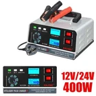 Product description: Multi-function charger: 12V / 24V lead-acid battery charger, automatic intelligent battery charger, suitable for GEL, SLA, WET charger.(non-rechargeable lithium battery) Stop when full: Connect the battery and plug it in. The power can be charged automatically without adjustment. The CPU's precise control plus multiple protections can automatically stop at full power, so you can rest assured. Multiple protection functions: over-temperature protection, over-current protection, over-charge protection, reverse connection protection, short-circuit protection, voltage stabilization protection and multiple intelligent protection. Advantages: The LED displays the charging status and the voltage is clear. It is suitable for charging 12V batteries. It is suitable for use in cold weather and low voltage. It is also very suitable when the car is parked for a long time without electricity or the battery is aging. Wide range of applications: charging fully depleted 12V / 24V sealed lead-acid batteries for maintenance, including lawn mowers, boats, cars, electric vehicles, power tools, ride-on toys. Features: 100% new high quality This battery charger uses a micro MCU controller to manage the battery charging process. With online battery detection, short circuit protection, over voltage protection, reverse connection protection and other functions. The smart charging indicator directly displays the charging process, making it easy for users to manage battery current. Dual digital LED display High power rechargeable automatic smart car battery charging 12 / 24V Product name: Smart Pulse Multifunction Repair Charger Specification: Voltage range: 110V-250V Product specifications: 180 * 145 * 70mm Working efficiency: 98% Rated power: 400W Plug Type (option): EU Plug , US Plug Working temperature: -30 ℃ to + 50 ℃ Working mode: pre-charge-constant current-constant voltage-trickle The actual output current for charging a 12V battery is max about 30A The actual output current for charging a 24V battery is max about 20A Package Included: 1 * battery charger 1 * Instruction Manual
