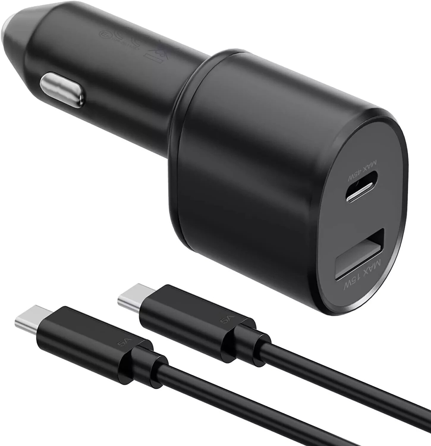 45W Samsung Adaptive Fast Charging Dual-Port Car Charger With Type-c Cable Car charger can charge two devices at the same time . Support PD3.0/QC3.0/QC2.0/AFC/FCP . Port 1 : 45WType-C connector . Support PD3.0/Q Super Fast Port 2: 15W USB-A connector . Support PD2.0/Q Fast only Build: METAL&ABS MATERIAL SAFE SECURITY: The solid full Aluminum Alloy body features exquisite texture and durable lifetime, and protects your devices from over-heating, over-voltage, over-current. Package Includes: 1x 45W/15W Car Charger 1x USB C&C Cable 3 Feet Long-3Amp PD