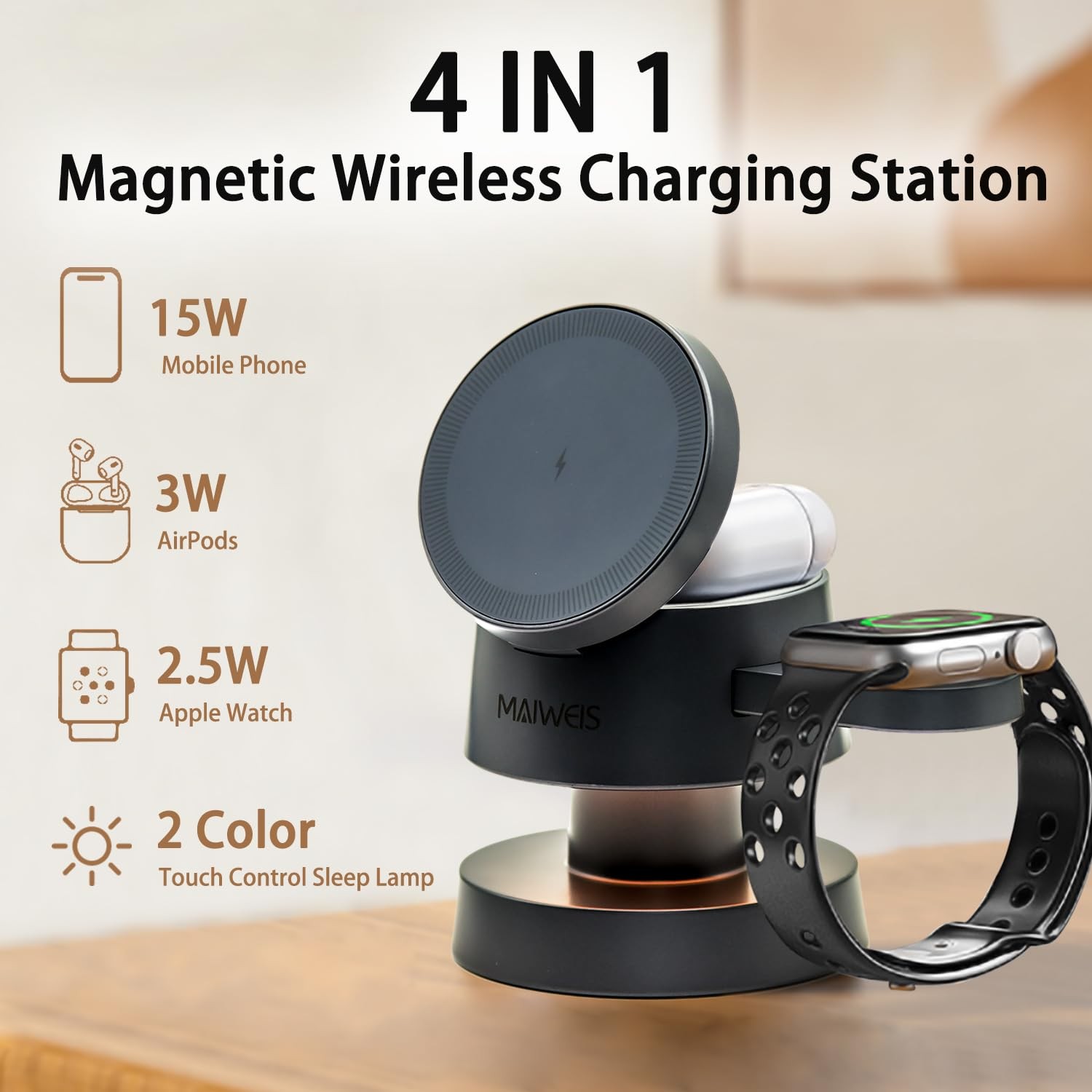 4 in 1 Magnetic Wireless Charging Station with Mushroom Night Light, Foldable Multiple Devices Charger, for iPhone 16/15, Apple Watch, AirPods(Includes PD 30W Adapter) 【4 in 1 Magnetic Charging & Ambient Lighting】Charge multiple devices (phones, earbuds, smartwatches) with precise magnetic alignment. Adjustable 2-level mushroom night light for bedtime or workspace ambiance. 【Universal Compatibility】Works with MagSafe-enabled smartphones (post-2020 models) and select Android flagships. Requires magnetic accessories for non-MagSafe devices. Not compatible with wired charging. 【Smart Safety System】Overheat protection & foreign object detection (max temp: 104°F). Use certified PD 3.0 adapters (included) and avoid obstructions/high-temperature environments. 【Portable Foldable Design】Compact all-in-one wireless magnetic charging station with anti slip base. Very suitable for bedside tables, desks, or travel. 【Smart Power Distribution】Automatically allocate power when charging multiple devices, hidden watch charging stand. Continuous power supply is required (without built-in battery, Not compatible with Samsung watches). 【Ideal Gift Choice】 Packaged in an elegant box, this charging station is a thoughtful and practical gift for family, friends, or colleagues. Perfect for birthdays, holidays, or special occasions.