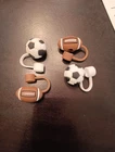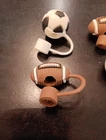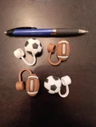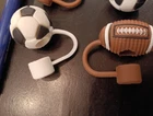 The product is a set of four reusable silicone straw covers caps designed with a soccer and sports theme. Each cap is decorated and serves as a protector for the straw tips, with a height and width of 2.50cm. The set comes in assorted colors and is suitable for use by teens, boys, girls, and adults. It is manufactured in China and weighs 48.00 grams. Personalization is not available for this item.