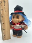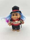 This product is a lot of two Russ 5" Easter Magician Troll Dolls, with one doll wearing a rabbit hat and the other wearing a Prince Charming outfit. The dolls have blue and red hair and are vintage, originally manufactured in the 1990s. They come in their original packaging, which has been opened. The dolls are made of plastic and are part of the Trolls character family. They include a hat as a set item and are suitable for Easter and Halloween occasions. The product is an original, not a reproduction, and was made in China. sku 314