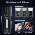 Description : Super Bright Rechargeable Flashlight: Equipped with upgraded efficient laser Chip LED chips, the rechargeable flashlight emits a stable and super bright lighting. Since the light penetration is stronger than other same-level lamp beads', its beam can pass through dust and fog well, especially suitable for foggy and rainy days with low visibility. 5 Light Modes & Zoomable Focus: There are 5 modes of the rechargeable flashlight: High / Low / Strobe for the main light, and White / Red&Blue Strobe for the COB side light. Equipped with zoomable head, the small rechargeable flashlight high lumens can emit a powerful focused lighting and an extensive extended lighting by adjusting the light head. Fast Charging & Power Indicator: Built-in a rechargeable lithium-ion battery and equipped with more energy-efficient chips, the rechargeable flashlight battery powered working time is up to 7 hours with the low mode. The USB C fast charging input achieves 30% reduction in charging time. It can be charged by power bank, USB plug, etc, with the USB C charging cable. You can clearly see the remaining power at the digital power indicator. IPX6 Waterproof: This flashlight head adopts the high grade black aluminium alloy, and the frame adopts the ABS plastic. The waterproof grade of this flash light reaches IPX6 Waterproof. This rechargeable flashlight is non-slip, shockproof, waterproof, rainproof, dustproof. It can work well in severe outdoor weather conditions, such as rain and snow. It is an ideal outdoor handheld flashlight for working, hiking, camping, repairing, hunting, and Sogidon fishing. Easy to Carry: Led flashlight is equipped with lanyard and pocket clip, which can be hung on your wrist or attach to your pocket , backpack shoulder strap, hat and belt. As its compact design, you carry this small handheld flashlight in your pocket or the car glove compartment. Specification : Product Type: Flashlight Color: Black Weight: 180g Waterproof: IPX6 Working Time: 4-7hrs Charging Time: 3.5-5hrs Material: Aluminum, Plastic Battery Capacity: 3000mAh Power Source: Battery Powered Charging Method: Type-C Charging Size: 15.3*3.5*2.8cm / 6.02*1.38*1.1inch Lighting Mode: 5 Modes(High / Low / Strobe for the main light; White / Red&Blue Strobe for the COB Side Light) Package Included: 1 x Flashlight 1 x USB Cable Note: Due to the different monitor and light effect, the actual color of the item might be slightly different from the color showed on the pictures. Thank you! Please allow 1-2cm measuring deviation due to manual measurement.