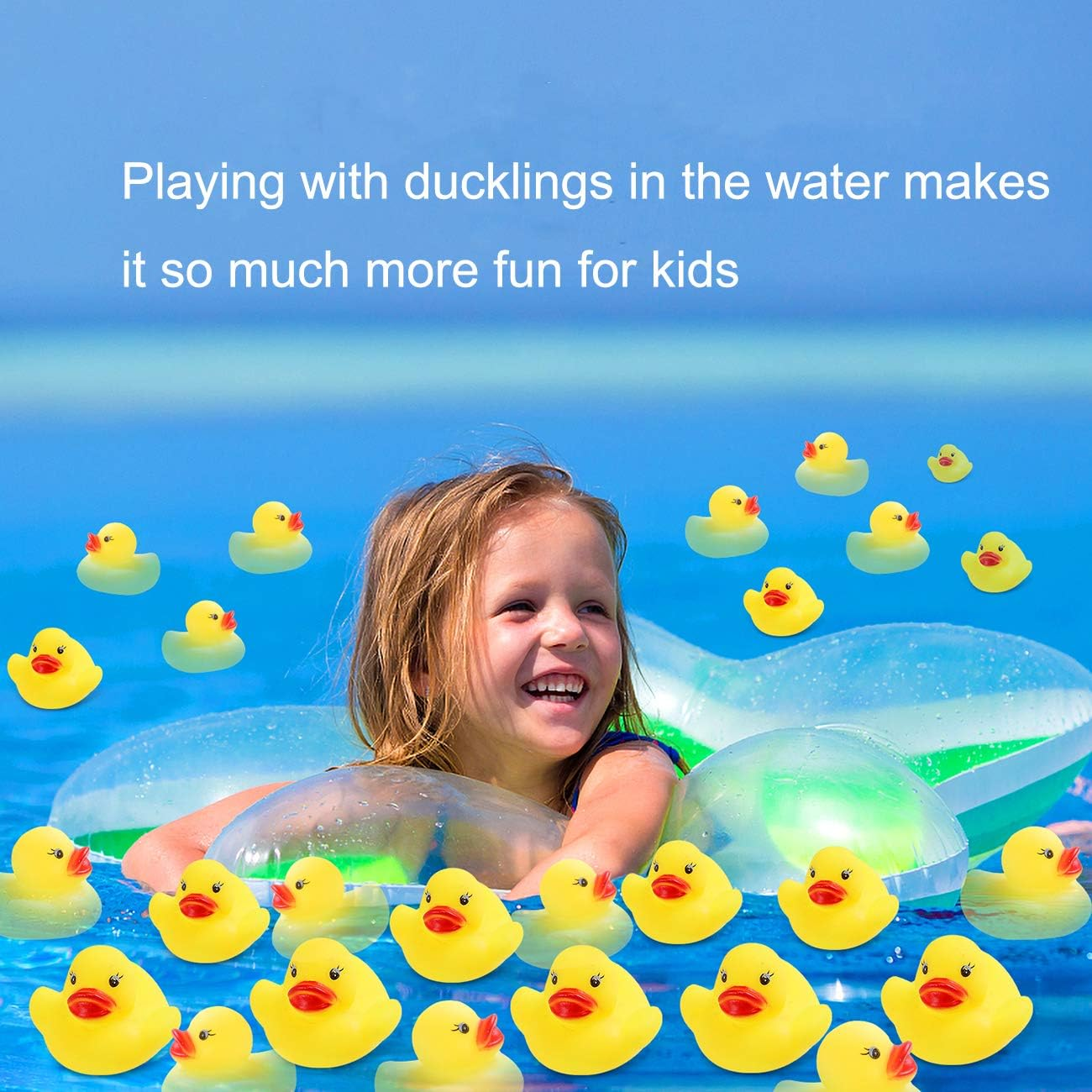 Material: Mini rubber duck is made of safe rubber. It’s odorless, waterproof and fadeless , not easy to break. Parents, teachers and guardians can take a break without worrying, and children can paly with it safely and joyfully. Fun Bath Toys: The little rubber ducks are cute and can float on the water. When you squeeze them, they will make funny sounds, adding great fun to the bath, so it is very suitable for shower or playing in bathtub. Interesting Gift: These tiny rubber ducks are super cute in appearance. They are interesting, which can bring joy to your family and little ones as wonderful gifts for Birthday Parties, Baby Showers, Classroom Rewards, and themed event! Nice Educational and Entertainment Tool: These bright yellow duck party favors are nice for developing hand eye coordination, fine finger skills, color recognition and cognitive processes, suitable for teaching toys, and party supplies. Endless joy: With these cute bright yellow mini rubber ducks, parents are able to have a fun time with their babies, kids can spend a delightful day with friends. Product Description Water Toys for kids Baby Bath Toys Pool Toys for Kids Summer Beach Toys A thoughtful gift for you and your baby! A thoughtful gift for you and your baby! 1. Every duck weights 5g, they can float upright on the water. They could make babies enjoy the bath time. These cute ducks are not just toys. They also help babies to develop intellectual and physical abilities. 2. Mini size ducklings have red lips, yellow body, and black eyes. They can stimulate kids’ senses. The continuing grip exercise such as squeezing is one of the best ways to develop muscle strength in early stages. Warm Tips: 1. When you use the Tiny duck for the first time, please use a wet towel to wipe it clean or put it under the water. 2. Little baby duck has a question mark on the bottom. Kids could try to remove it out of curiosity. Please watch your kids when they are playing with them. Bath Time Joy Wide Usage: Small rubber ducks for kids bathroom decor, Birthday Gifts, Baby Showers, Classroom Incentives, Summer Beach, pool party, bath party and Pool Activity Package includes: 50 pcs tiny rubber ducks Size of each duck: 1.7in x 1.4in(bottom length x height) as shown in the picture