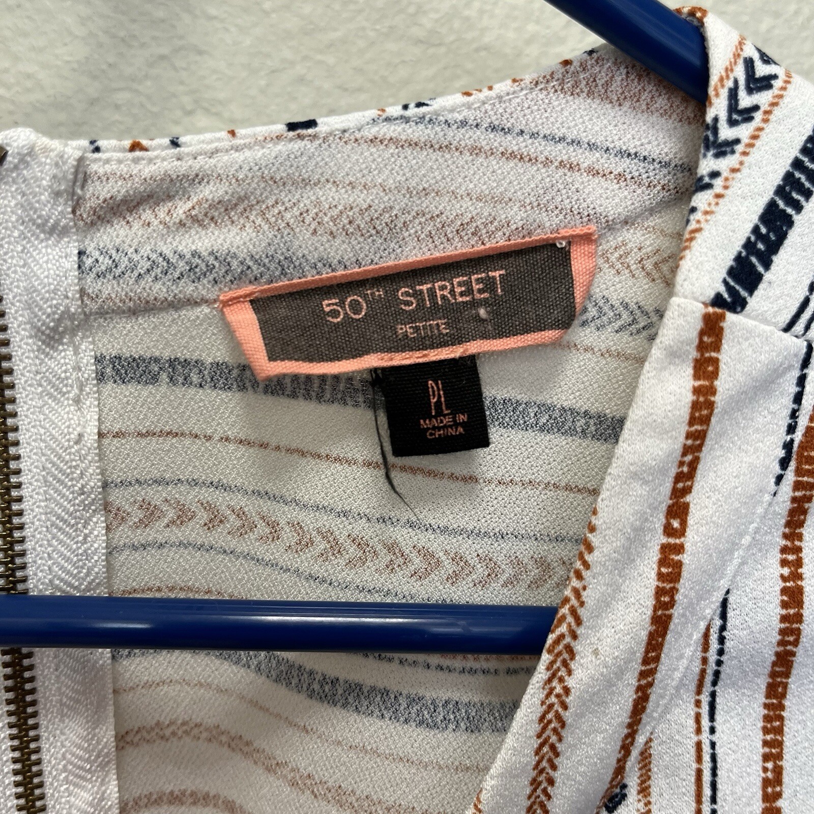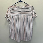This is a Petite Striped Short Sleeve Top by 50th Street in size PL. It features a Round Neck, Zip Closure, and is made of Polyester and Spandex. The top has a Knit fabric type with Studded and Zipper accents, and comes in a Multicolor design. It also includes Pockets for added functionality. In excellent condition with very little wear Measures approximately 21” across bust laying flat, 24” in length from shoulder to hem in front, and 27” in back A6