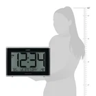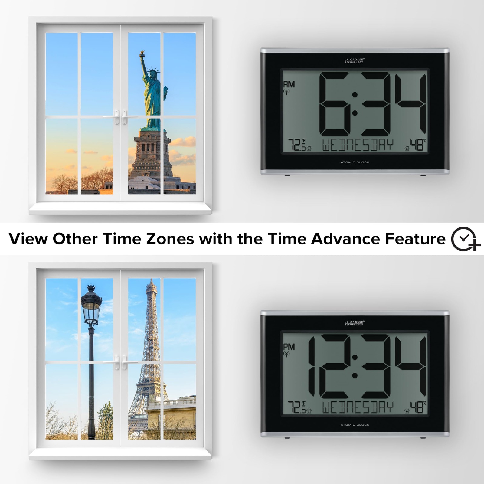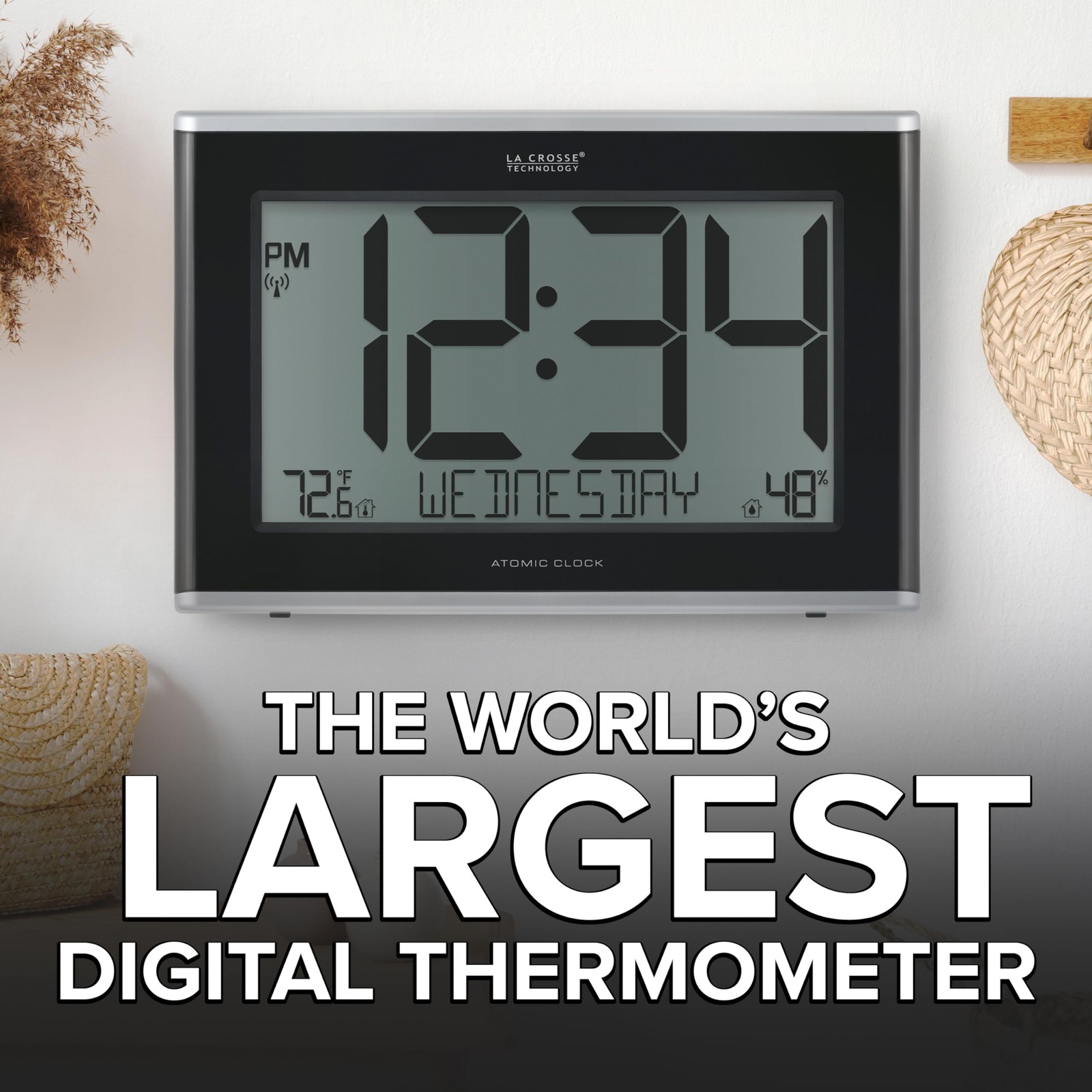 Large 5.7" digital time with 12/24 hour view Atomic self set with Automatic Daylight Savings time reset (AUTO/ON/OFF options) Adjustable calendar view and Auto-Scroll feature Indoor temperature (F/C) with humidity (%RH) Battery operation (requires 6 AA alkaline batteries, not included)