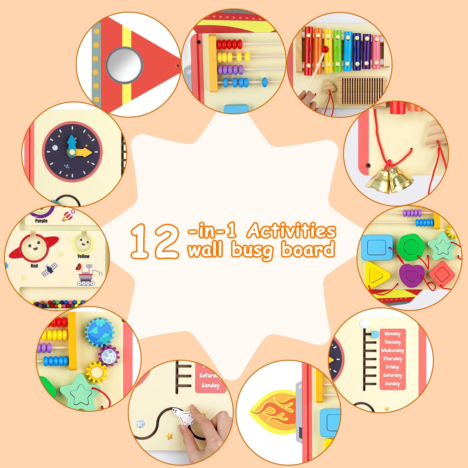 Containing a variety of Montessori educational significance of the 12-in-1 large wooden busy plate, to improve children's fine skills and hands-on abilities. Wall Mounted Rocket Board: Multi-functional activity board for toddlers and preschoolers, version incorporates Montessori philosophy with 12 fun activities for multiple children to play together, promoting early education and skill development. FUN MEETS LEARNING: Montessori large sensory board has 5 major boards, sensory board, exploring music, color sorting, time concepts, cognitive skills, promoting exploration and sustained interest among children. SAFETY FIRST: The interactive activity boards are made of high quality natural materials that are sturdy and durable for long term use. Each board is free of sharp edges and burrs to ensure a safe play environment for young children. WALL MOUNTING: Each panel is secured to the wall with individual fittings to ensure that it does not fall off and cause unpleasant accidents when used by children, and can be easily mounted to the wall in just 10 minutes! MULTIPLE SCENARIO USE: Designed with a rocket theme, this set of wall panel toys is both decorative and practical, suitable for nurseries, playrooms, classrooms, kindergarten, sensory rooms, and homes, and can add a splash of color to any space.