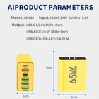 Description Report Item 65W 6 port USB fast charger PD type C fast charge 3.0 wall charger adapters for iPhone 15 14 Pro Xiaomi Samsung Samsung phone charger 1. Multi-port fast charger. 2. Suitable for various models. 3. Comprehensive protection for your charging , including over-temperature protection, short circuit protection and over-current protection. 4. Super fast charging, with 100% speed increase. 5. Small size, high power and easy to carry. 6. multiple devices By sharing, you can quickly fill multiple devices simultaneously, so you don't have to worry about priorities. 7. Model: Input: AC 100-240V 50/80Hz 0.8A. Output: 2. 1/2:5V 3A (per port). 1/2/3/4: 5V 3A (per port). 1/2 + 1/2/3/4: 5V 3A. Translated with DeepL.com (free version)