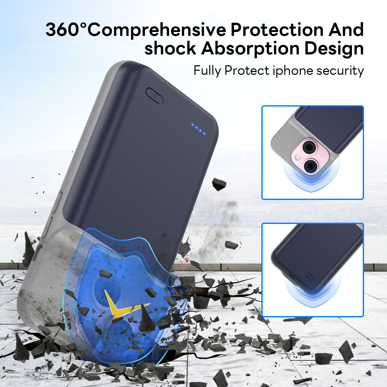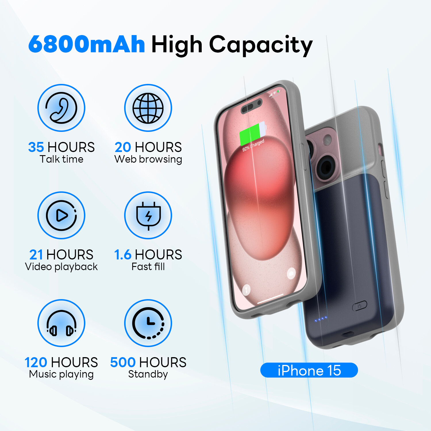 New TQTHL High Quality External Battery Case / Backup Power Bank Compatible with: iPhone 15 (6800mAh) Please note that this is a variant series, we will ship it according to your choice Features: Extended Battery Life: The charger case offers substantial extra battery life, allowing you to use your iPhone 15 for an extended period without worrying about running out of power. Custom-Fit Design: The case is precisely designed to fit the iPhone 15, providing a snug and secure fit for your device. Convenient Charging: The case allows for convenient charging of your iPhone 15 on the go, making it perfect for travel, work, or other situations where access to a power source may be limited. Slim Profile: Despite the added battery capacity, the case maintains a sleek and slim profile, ensuring your device remains easy to handle and doesn't add unnecessary bulk. Easy Installation: Installing and removing your iPhone from the case is a hassle-free process, and it offers easy access to all your device's ports and buttons. Specifications: Input current: 5V 1800mA Output current: 5V 1500mA Working temperature: 0°C-45°C Battery capacity: 6800mAh Storage / transport temperature: -20 ° C ± 50 ° C Charging time: ~4 hours Package included: 1 x Battery charger case 1 x User Manual