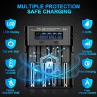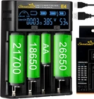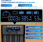 4 bay 18650 battery charger:Compatible with 3.7v Lithium li-ion rechargeable batteries 18650 26650 21700 18350 16340(RCR123) 10440 17670 18490 17500.And 1.2V/Ni-mh/Ni-cd batteries AAAA AAA AA A.The charger will automatically recognize the battery type Lithium Battery Charger: The 18650 battery charger has an LCD display, The button C switches the monitoring status, which can display the charging voltage, charging time, charging capacity, and charging progress% of each charging slot. Button A switches the charging current 0.5A/1A/2A, the 2500mAh battery can be fully charged in 1.5 hours Safety Protection: Safe and fire prevention PC+ABS material Battery Charger, Built-in intelligent circuits protection to protect the battery safety charged. A protection against short circuit, overheat, over-voltage and over-discharge. Distinctively, the discharging function can decrease the hurt of battery, making it more efficient Portable And Compact: 4 Slot Battery Charger Design Can Charge 4 Different Batteries At The Same Time, Equipped With 3 Input Ports: USB-C / Lightning / Micro, It Becomes Your Best Travel 18650 Universal Charger. Note: Only Charger,No Battery PREMIUM SERVICE: If you have any questions, please tell us at first time. We will provide professional service to solve your problems. There is a totally risk-free purchase. Product Description 18650 Battery Charger,LCD Display Smart Universal Charger for 3.7v Lithium Li ion Rechargeable Battery 26650 21700 18650 RCR123A,NiMH NiCd AAA AA A/C Smart button The button C switches the monitoring status, which can display the charging voltage, charging time, charging capacity, and charging progress% of each charging slot. The Button A switches the charging current 0.5A/1A/2A, the 2500mAh battery can be fully charged in 1.5 hours 4 bay 18650 battery charger Compatible with 3.7v Lithium li-ion rechargeable batteries 18650 26650 21700 18350 16340(RCR123) 10440 17670 18490 17500.And 1.2V/Ni-mh/Ni-cd batteries AAAA AAA AA A.The charger will automatically recognize the battery type.
