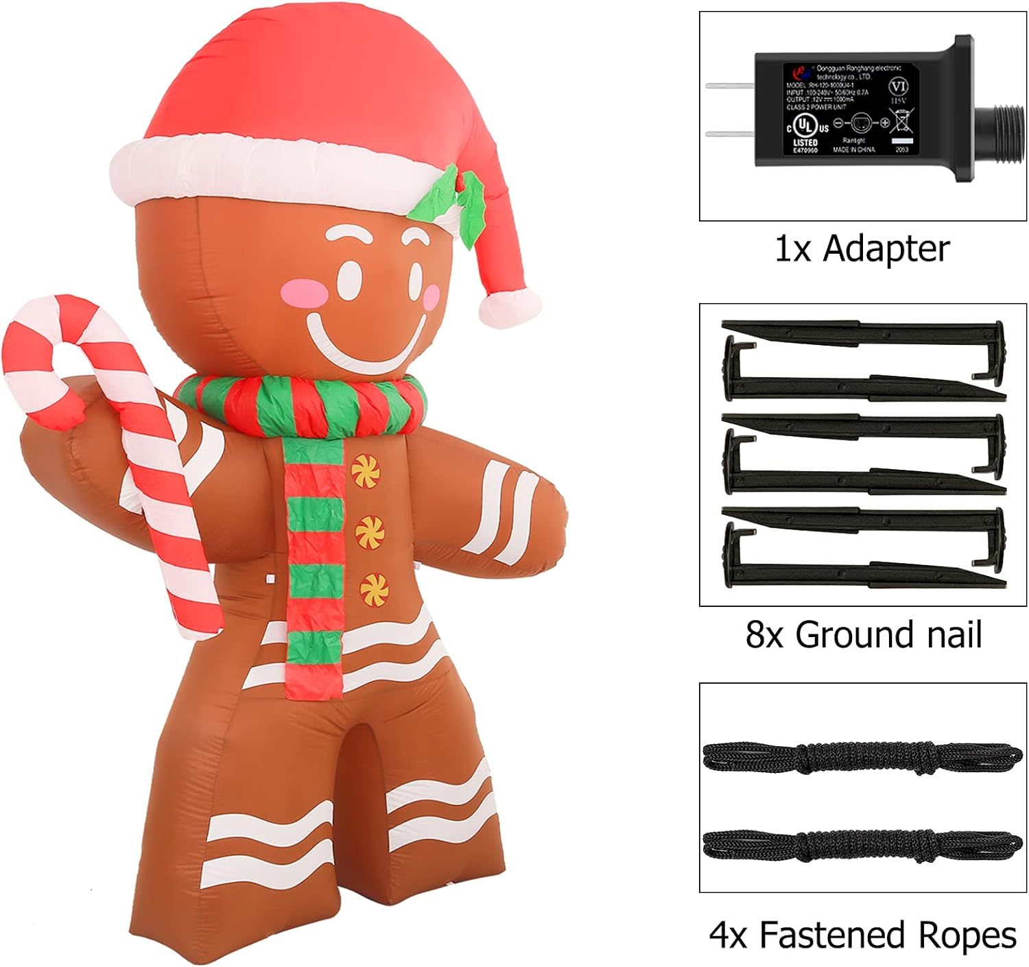 High Quality Durable Material & Easy to Inflate - Made of high quality Polyester material, which is strong, secure and durable material, not easy to tear, adds the perfect touch for Christmas! The inflatable Gingerbread man is super easy to inflate, just zip it up and plug it in, you will see It go from laying down to fully inflated within a couple of minutes. Taking it down is just as easy, simply unplug it and roll it up. Build-in LED Light - Super bright LED light and colorful design are the spotlight of your Christmas decorations. There are bright LED lights inside, This Inflatable Gingerbread Man will really stand out and be visible even on the darkest night with his bright lights. If you like the design, this will be a good addition to your Christmas decoration! Stable and Steady Enough - Don't worry that the Christmas inflatables will fly away with the wind. It came with 8 stakes and 4 rope to hold in place if necessary. and built in sandbags. It is easy to stake down and seems fairly sturdy. BLOW UP FAST- Setup is super simple. Just plug it in, everything pops up in a minute! The package comes with an extended cord, fan, ground stakes, fastened ropes, built-in sandbags, and a plug with UL certification. Great for Festival - 8 FT Gingerbread Man Inflatable is ideal Christmas blow up yard decorations. The Christmas Inflatables will light up your yard and welcome your lovely neighbors. Entertain your guests and family with this fun Gingerbread Man inflatable. Perfect for Christmas Indoor outdoor yard garden lawn decorations, Christmas event decoration, party decorations. Product description