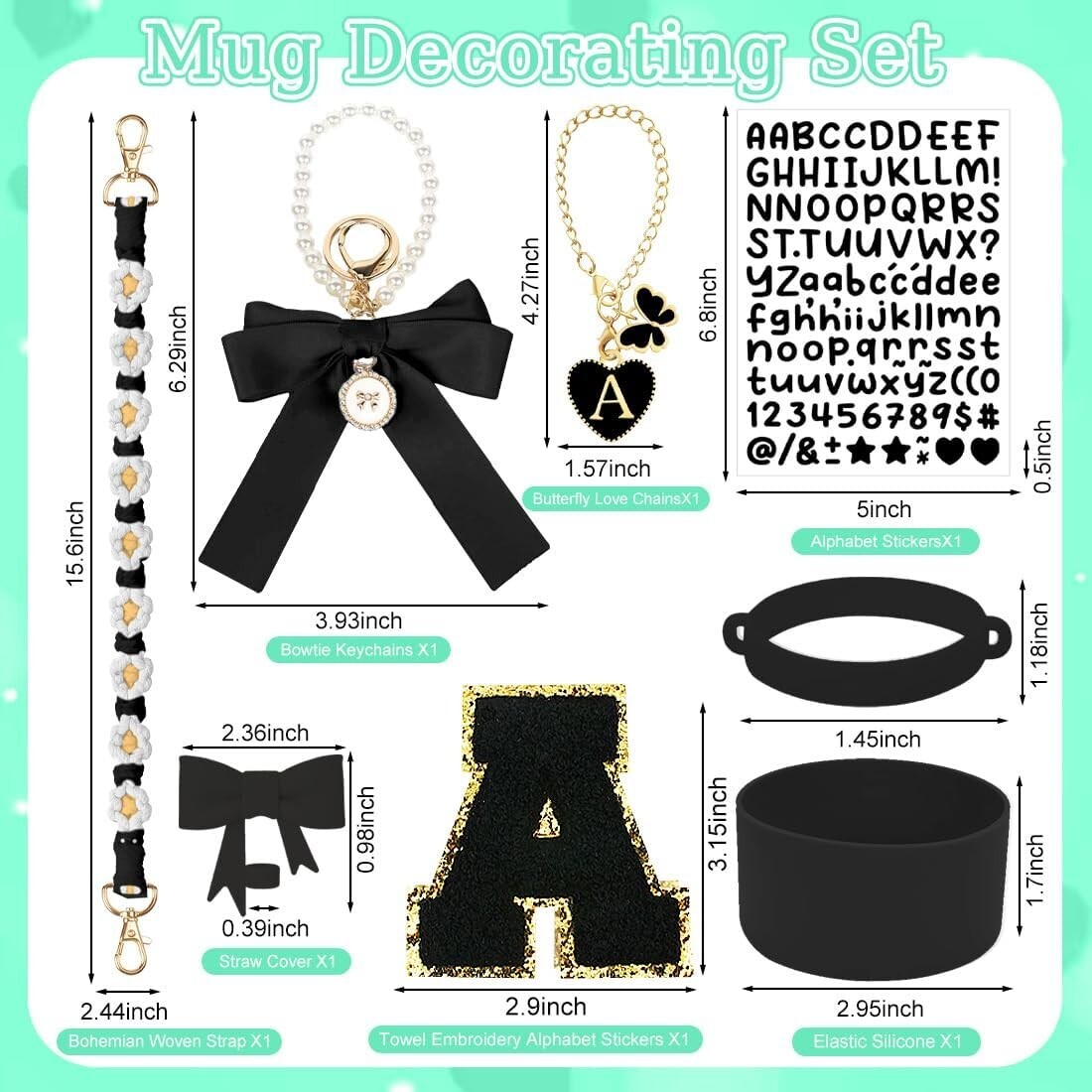 Stanley Cup Accessories Set,8Pcs Cup Accessories Including Straw Topper,Silicone Stanley Boot,Cup Charm,Stickers for Water Bottle and Other Accessories About This Item : [Perfect Tumbler Accessories Set] Our product includes1 water woven bottle handle strap,1pc rubber cup ring,1 pc shining letter charm, 1 pc silicone boot, 1pc bow keychain,1 pc Bow straw cover, and 1pc initial letter cup sticker,1pcs sticker. This cute water bottle accessories set will make you shine bright like a diamond. [Perfect Tumbler Accessories Set] Our product includes1 water woven bottle handle strap,1pc rubber cup ring,1 pc shining letter charm, 1 pc silicone boot, 1pc bow keychain,1 pc Bow straw cover, and 1pc initial letter cup sticker,1pcs sticker. This cute water bottle accessories set will make you shine bright like a diamond. [Personalized Design] Different letters for charms and stickers are provided, so you can choose any letters you like. You can spell out your name with a sticker. The water bottle charms and stickers not only can make your tumbler special and shining, but also can make you identify your cup easily. [Multi Functional] Stanley cup Accessories you can be placed in your vehicle's cup holder and use where you need it, especially when going to school, party, walking, camping, travel, sports and outdoor activities. Also ideal gift for family and friends. [Compatible with Stanley 30 and 40 Oz] Our products are designed for Stanley Accessories 30 and 40 Oz, but they also can fit most tumbler brands. The boot fits 2.8 to 2.95 in narrow base tumblers.The diamond straw cover fits 10 mm straw.The bow is suitable for 8 to 12 mm straw. The initial bow charm can also be used as keychain and the sticker can be sticked to anywhere you want. Please measure the size before buying.