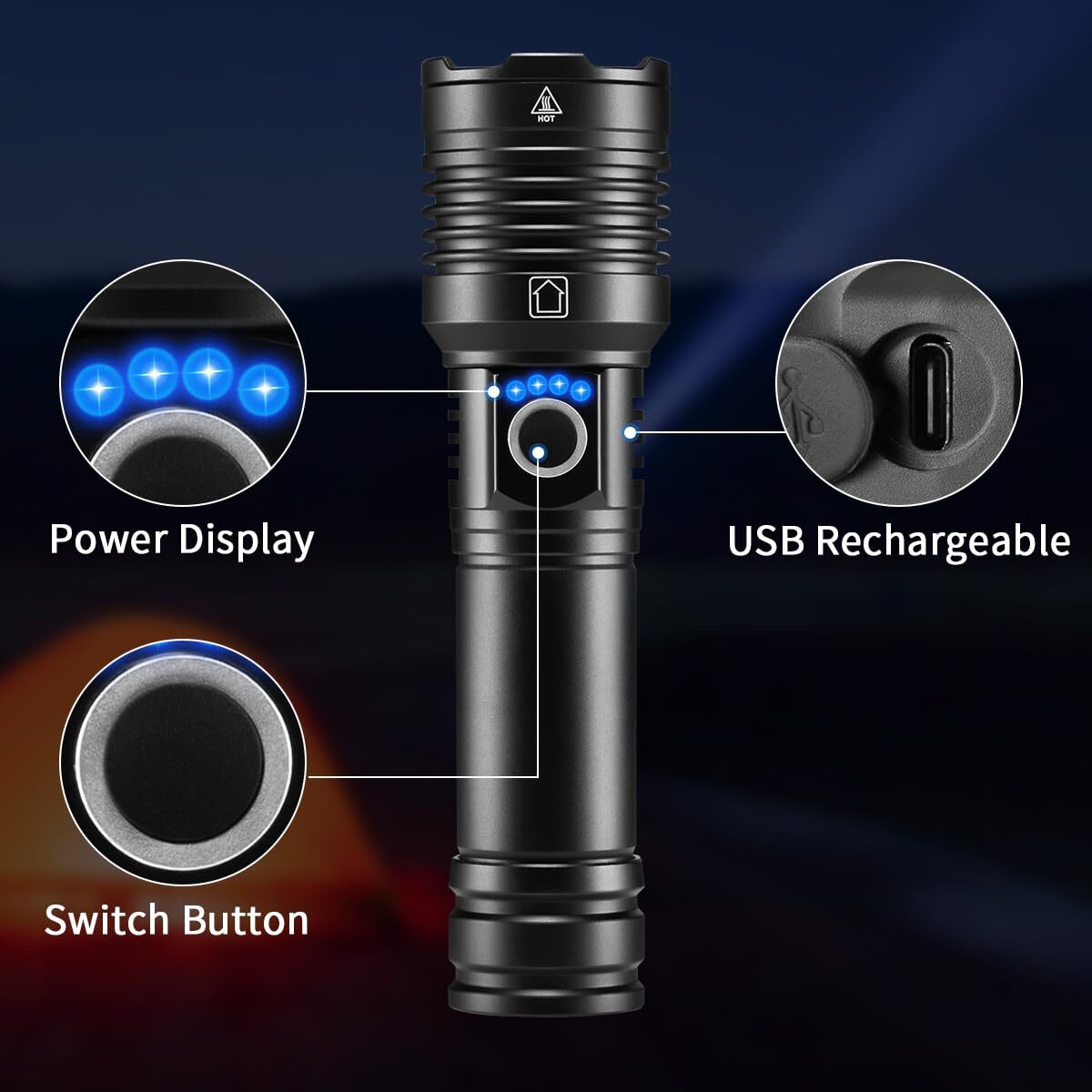 Rechargeable Flashlights High Lumens: flashlights high lumens equipped with upgraded high power LED chip, can provide brightness up to 990,000 lumen. Our super bright rechargeable flashlights with super bright LED bead could light up object far from 1,000ft away. 5Mode Rechargeable Flashlight: Flashlights high lumens rechargeable have 5 modes: High/Medium/Low/Strobe/SOS. It’s suitable for biking, camping, hiking, walking and emergencies, meeting different needs in your life. Long press the switch button for 3s, you can turn off the flashlights easily. Waterproof & Adjustable Tactical Flashlight: The flashlight is designed to withstand extreme weather like rainy and freeze. The head of flashlight rechargeable is adjustable, allowing you to stretch the top of the LED flashlight to adjust the focus. You can zoom out the head as spotlight for longer distance and zoom in as floodlight for wider area. High Powered Flashlight: There is four power indicators(100%, 75%, 50%, 25% of battery level), which assists you to know the battery level of the flashlight. Brightest flashlight use type-c input for charging. Please don’t use a high voltage or high current adapter to charge the flashlight, lest it be damaged. After-Sale Flash light Service: Package includes 1*bright flashlight rechargeable, 1*type-c charging cable, 1*user manual and 1*gift box. offers a 12-Month Replacement Policy for any quality problems about super bright flashlight. For any problems, please click “Get Help With Order” under your order ID, we will solve your issues within 24hours. *lucky*vorobey* Kindly note: If you would like to order more quantity than shown is available, you are welcome to place one order fox maximum available quantity and place one more order again because we always have more, than shows in available items. Best wishes TRANSLATE with x English Arabic Hebrew Polish Bulgarian Hindi Portuguese Catalan Hmong Daw Romanian Chinese Simplified Hungarian Russian Chinese Traditional Indonesian Slovak Czech Italian Slovenian Danish Japanese Spanish Dutch Klingon Swedish English Korean Thai Estonian Latvian Turkish Finnish Lithuanian Ukrainian French Malay Urdu German Maltese Vietnamese Greek Norwegian Welsh Haitian Creole Persian