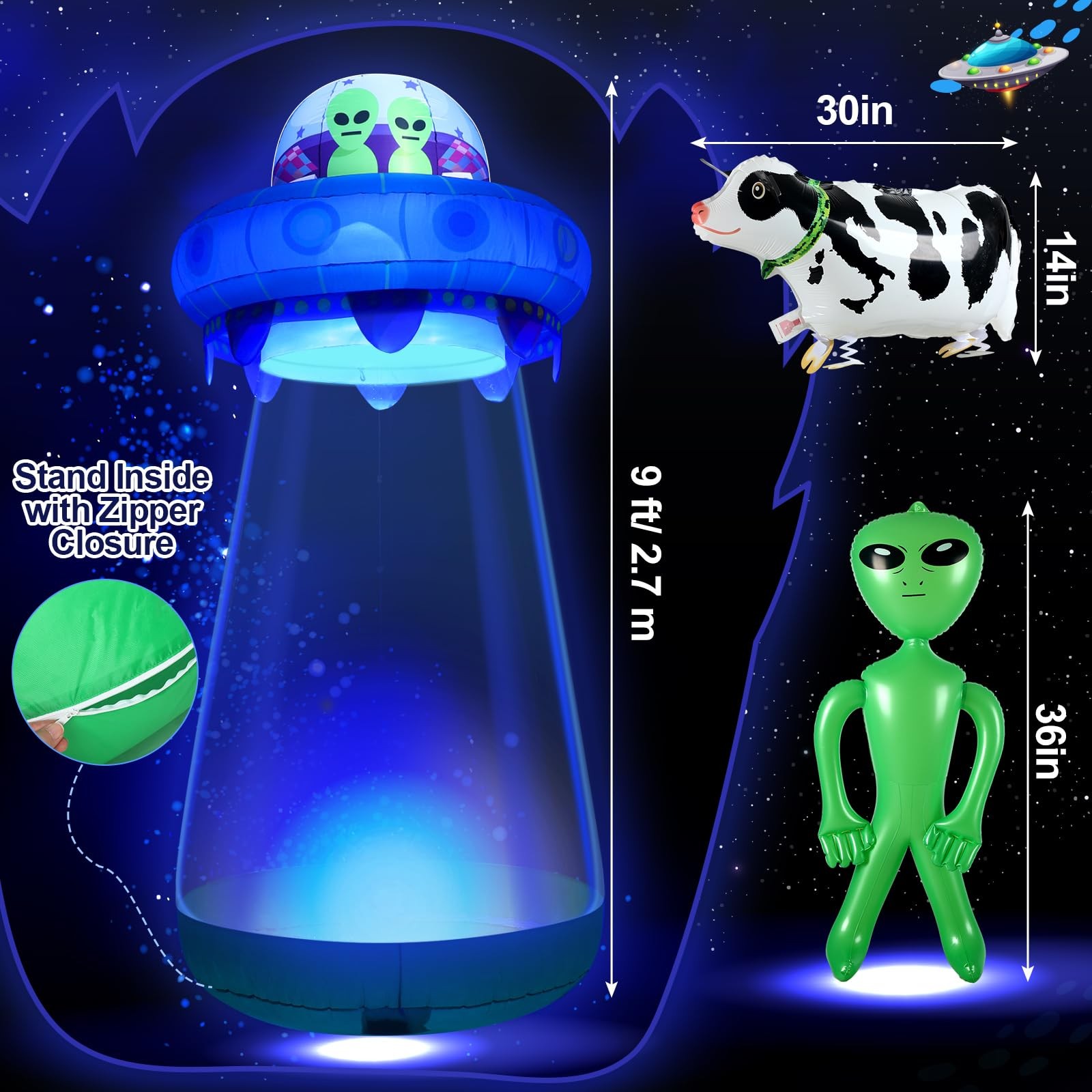 Features: It comes equipped with built in LED lights, making it visible in the dark and enhancing the eerie presence of the UFO alien, it's an ideal showpiece to amuse your Halloween party guests. Crafted from quality, reliable, and weather resistant material, this Halloween decoration is designed to withstand outdoor conditions, ensuring you can use it year after year. Specifications: Main material: waterproof material Main color: blue and green Size: UFO: about 9 ft/ 2.7 m high Alien: about 36 inches tall Cow: about 30 inches long Package includes: 1 x Inflatable UFO with LEDs 1 x Alien decor 1 x Inflatable cow decor Notes: Manual measurement, please allow slight errors on size. The color may exist a slight difference due to different screen displays. 9 Feet Tall UFO Inflatable Yard Decor Sets: three piece outdoor inflatable UFO set, including inflatable UFO, alien and cow; The oversized UFO is very decorative in the yard; The UFO has a zipper; People can enter when the zipper is opened, and then close the zipper, as if a person is trapped by the UFO; It's like it's been sucked away Extra Large Size: the entire UFO is about 9 ft/ 2.7 m high, and can accommodate an adult when unzipped; The alien is 36 inches tall, and the cow is 30 inches long; It is very eye catching and is a novelty and cool Halloween decoration Halloween UFO Yard Fun: there is a hook in the middle of the product; After the cow is inflated, attach it to the hook and enter the inflatable UFO kit; It is as if the UFO sucked you and the cow away together; 36 inch green alien inflatable toy, take you to experience the excitement of extraterrestrial life! Light up the lights at night to provide optimal appeal to neighbors and guests; Ideal for space themed Halloween parties and yard decorations Bright Built in LED Light: the entire UFO inflatable model exudes blue purple light, full of mystery and horror; The outdoor inflatable UFO is made of high strength waterproof material, which is sturdy, reliable, and reusable; In addition, this outdoor inflatable equipment is equipped with a powerful blower, which can inflate the decorations with continuous air flow; Since the inflatable product is large, it takes a while to wait for the blowing time after plugging in the power supply Ideal Decoration for Halloween: ideal for Halloween outdoor patio garden decorations, trick or treat event decorations, Halloween night events, Halloween haunted house decorations, Halloween space themed decorations, Halloween costume party decorations, stage props, birthday parties, and more