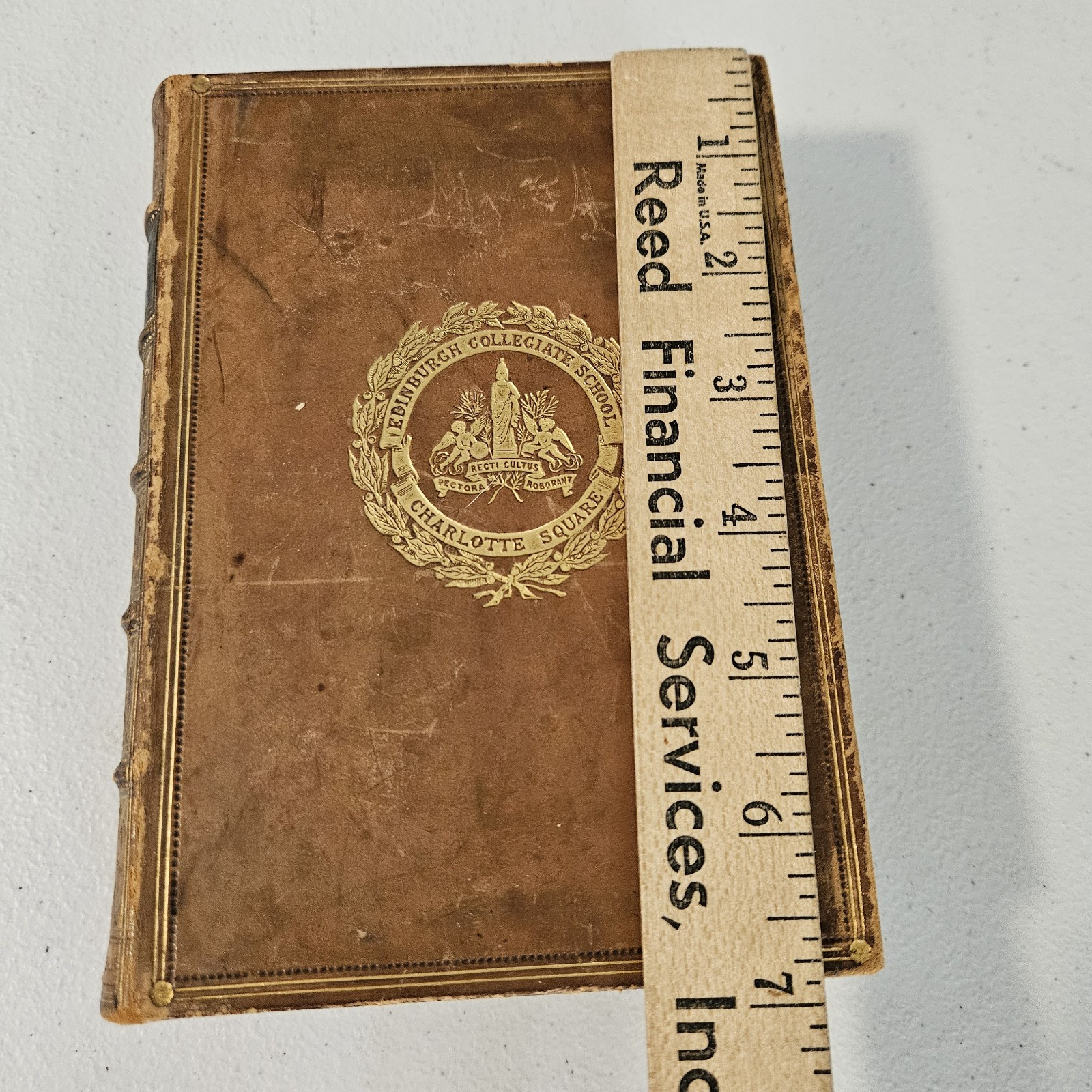 This is a beautiful antique book from the Edinburgh Collegiate School acharlotte Square. The pages are in excellent condition. The back hinge is intact but just a little loose.