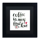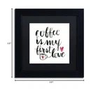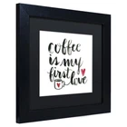 This ready to hang, matted framed art piece features the phrase "coffee is my first love" in black ink on a white background. Elizabeth (Rodriguez) Caldwell is a surface designer with a passion for doodling and hand lettering. She holds a degree in graphic design from William Paterson University where she was chosen to represent her Alma Mater at Nottingham Trent University in the UK for year as a design student. This is where her love of mixed media and hand drawn typography was born and flourished. Elizabeth landed a job at a stationery company shortly after graduating where she learned all about repeats and product design and knew she had found her calling. With over 14 years spent in the stationery industry, her life is dedicated to creating beautiful art for products that inspire and bring joy to others. A 7x7 giclee print under acrylic in an 11x11 black frame. Giclee (jee-clay) is an advanced printmaking process for creating museum quality fine art reproductions. This high quality print is matted using black matting and comes in a black frame. A clear acrylic facing is added to protect the print. The piece is fully assembled by professional framers and comes ready to hang. The black mat allows the image to really stand out, making it a great addition to any space. Artist: Elizabeth Caldwell Subject: inspirational quotes Style: Contemporary Product Type: black frame, black mat, Acrylic Made in USA
