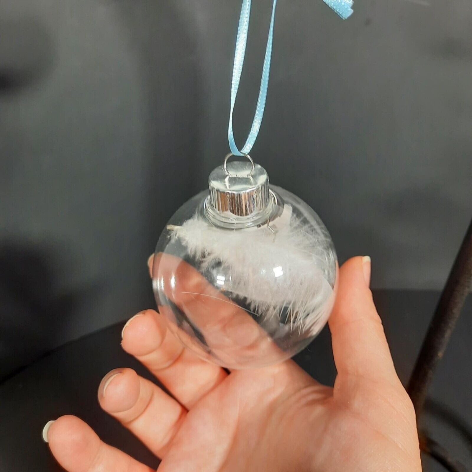 Clear glass ornament filled with a delicate white feather, featuring a white decal of the "I Love You" hand sign from American Sign Language (ASL), complete with a heart detail. This ornament is a unique and thoughtful piece, perfect for adding a personal touch to your holiday decor or gifting to someone special. It comes with a light blue ribbon for easy hanging. Type: Bauble Occasion: Christmas Color: Clear Material: Glass, Feather Character: None Shape: Circle Set Includes: Bauble Features: Hanging, Handmade Number of Items: 1 Keywords: ASL ornament, I love you sign, Christmas ornament, Holiday decoration, Feather ornament, Glass ornament, Hand sign ornament, Unique ornament, Gift idea, Holiday gift, Christmas decor, ASL gift, Sign language, Ily sign