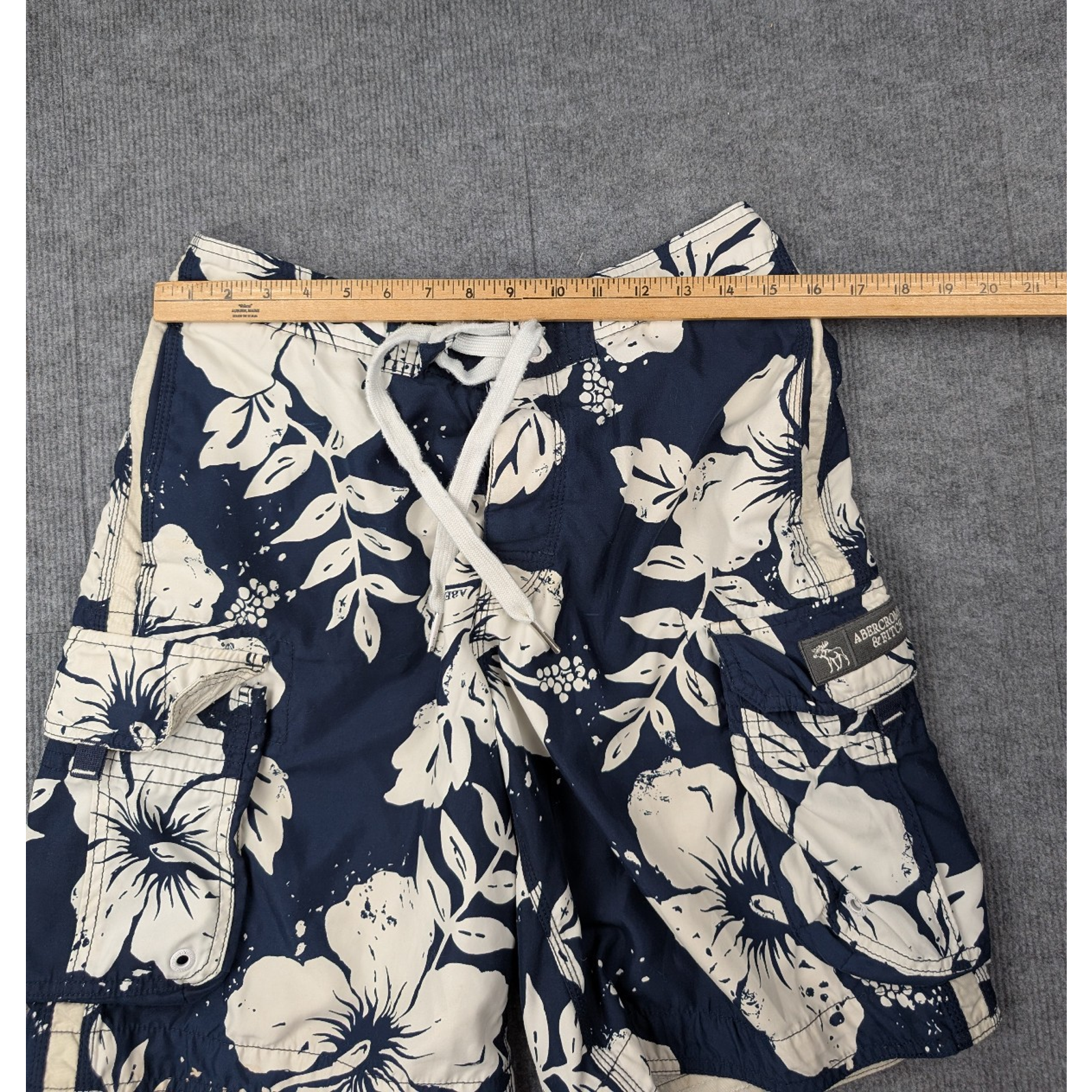 Brand: Abercrombie & Fitch Department: Men Type: Swim Trunks / Board Shorts Size: Mens 32 Color: Navy Blue / White Pattern: Floral / Hawaiian Material: 100% Polyester Lining: Mesh Closure: Drawstring Waist Features: Lightweight, Quick Dry, Cargo Pockets Occasion: Beach, Pool, Vacation, Summer Condition: Pre-Owned