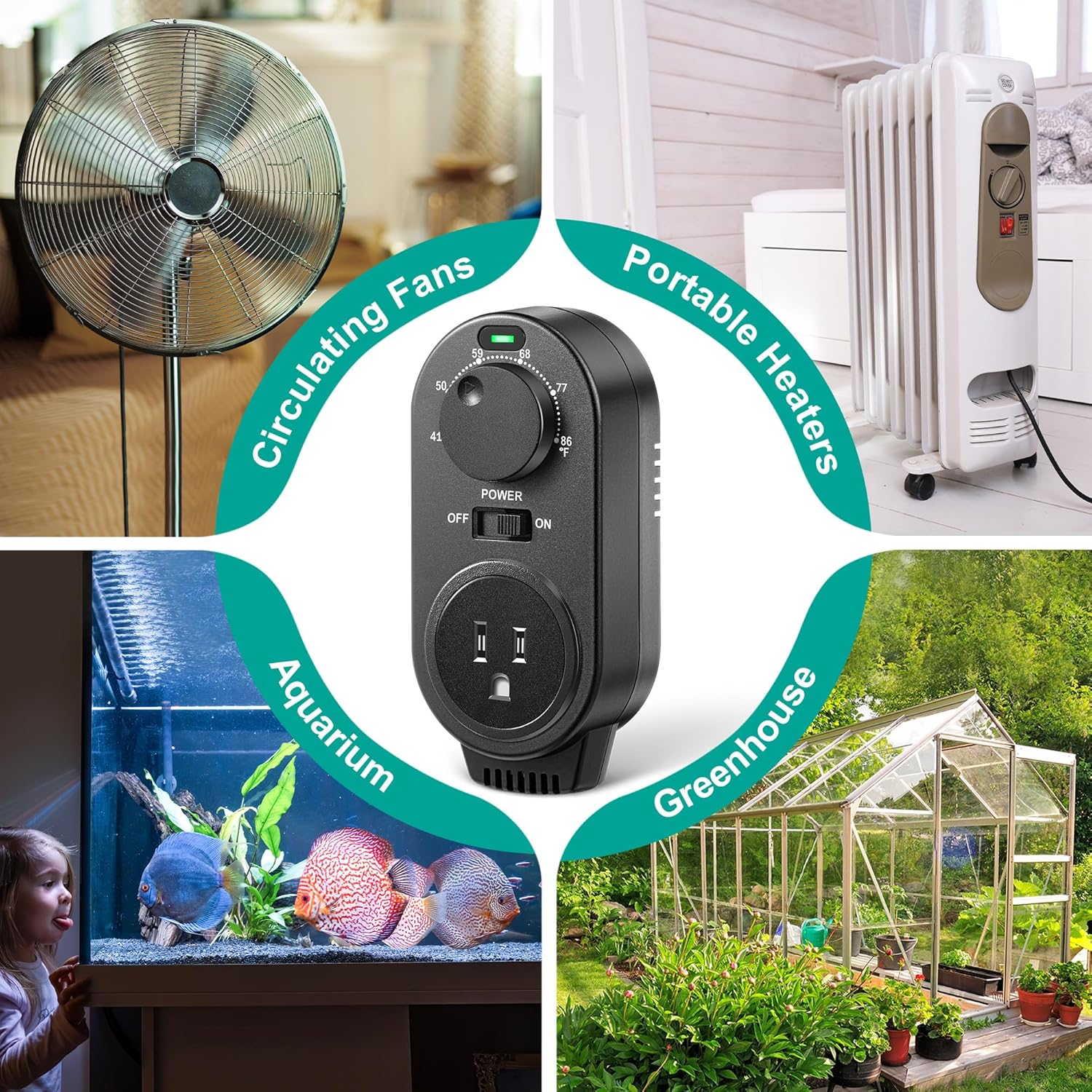 Store New Arrivals Add to Favorite View Feedback Contact Adjustable Thermostat Plug in Heating and Cooling Thermostat Controlled Outle Description Item Package Quantity 1 Color Black Controller Type Manual Button Control Special Feature Portable Thermostat Control: this non digital plugin thermostat comes with an adjustable temperature dial; Provide heat and cool 2 modes for you to choose, the thermostat will automatically turn on or off your heating or cooling equipment according to the target temperature you set, you can set the appropriate temperature (41-86 degrees Fahrenheit), maintain a stable room temperature for your greater comfort; Warm tips: please disconnect the power supply before switching the heat or cool mode Easy to Operate: plug and play design; No need to use other tools, just open the heat or cool mode button manually; Plug your heating or cooling device into the thermostat outlet, turn POWER switch to On, and you're ready to use; Just set your ideal temperature, the scale is clear, even the elderly can simply operate it; The LED light let you easily see if it is on or off too Safe and Reliable: this 3 prong thermostat plug into a standard socket; Temperature control range is 41-86 degrees Fahrenheit; Rated voltage is 125VAC 60Hz; Max Loading: 15A 1500W and has a recoverable overload short circuit; Dimensions: 5x2.5x2.5 inches; Do not immerse controller or probe into water Save Your Time: the thermostat will make your life comfortable; The adjustable thermostat turns on and off appliances connected to outlet based on the target temperature; It uses power only when necessary, brings convenience to your life ABOUT US We offer the best prices around on high quality products. Our E-store includes media such as books, movies, music and games while offering electronics, toys, sporting apparel, clothing, tools, general home, garden items and more. SHIPPING We are always working hard to ensure your package arrives as soon as possible. Please understand that some factors like weather, high postal traffic, and the performance of shipping companies are outside of our control. We offer free shipping to the lower 48 states and ship within 2 business days of payment, usually sooner. We do not accept P.O. Boxes. Please provide a physical address. For shipping outside of the continental USA, we only use eBay's Global Shipping Program.The item is shipped to KY and then sent to the rest of the world. International customers are responsible for all duties and taxes. Continue to check out in order to calculate costs for shipping the item to your country. Messages regarding eBay's Global Shipping Program MUST be directed at eBay EXCLUSIVELY. RETURNS We offer a 30-Day Return Policy on items which you are not completely satisfied with. You have the option for a full-refund or an exchange of the item. No returns are available on items shipped outside of the USA. PAYMENT We accept PayPal. CONTACT US This page content is yet to come Please ad us to your favorite seller and visit again later Thank You CUSTOMER SATISFACTION We try our very best to make sure every customer is completely satisfied. If there's a problem, message us! We're happy to help.