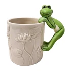 This is an adorable white ceramic mug featuring a frog as the handle. Perfect for enjoying coffee, tea, or other drinks. The mug is designed with a cute frog motif, adding a whimsical touch to your collection.