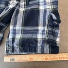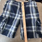 Aeropostale Authentic Cargo Shorts Mens 38 Blue Plaid Drawstring Pockets Y2K Pre-owned with light overall wash wear and fabric softening from normal use. Leg hems show minor wear and slight fraying, and there is mild fading at high-contact areas visible in photos. Fabric, seams, pockets, drawstring, and button/zip fly are clean, intact, and fully functional, with interior size and brand tags present. Brand: Aeropostale. Style: Mens plaid cargo shorts from the "Authentic Cargo" line with a relaxed casual fit. Color and pattern: Navy blue, light blue, gray, white, and green large-scale plaid. Tag size: 38 (mens regular). Department: Mens casual wear. Design details: Elastic waistband with external drawstring and button-zip fly, flat front, front slash hand pockets, dual side cargo pockets with flap and button closures, and back flap pockets with button closures. Features: Lightweight woven fabric suitable for warm weather, multiple cargo and flap pockets for storage, classic plaid pattern for everyday casual style, elastic waist with drawstring for comfort and adjustability. Branding: Aeropostale printed interior waistband label, small A87 logo tab at drawstring end, and woven A87 patch on a back pocket flap. Interior tag information: Inner label reads "Aeropostale Original Brand Registered Trademark" with style listed as "Authentic Cargo" and spec no. WA981-09; separate size tag shows 38. Occasion: Versatile cargo shorts ideal for casual outings, weekends, travel, and other warm-weather activities. 112647