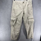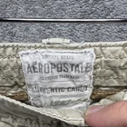 These are vintage Aeropostale cargo pants for men in size 30x32. They are made of beige canvas fabric with a relaxed fit and straight leg style. The pants feature a zip closure, button accents, logo detailing, and multiple pockets. Suitable for casual or workwear occasions, they have a mid-rise waist and are easy care, machine washable. Perfect for the modern, American man with a classic style.