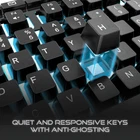Professional Gaming Keyboard: Coated keycaps and injection-molded engraved ABS keycaps design, characters, and letters are not easy to fade. Sweat-proof, prevent damage to keycaps, enhanced durability, and tactile feedback. Lights-On: Adjustable permanent Light Blue backlight mode, variable breathing, or permanent lighting mode. Even if there is no light, playing games at night will be great. You can also adjust the brightness of the backlight and breathing rate according to your preferences. Anti-Ghosting: Enjoy your gaming sessions with precise keypresses that register 100% of the time, regardless of how many keys you are pressing at the same time. Full Size: This is a 100% gaming keyboard with 104 keys: 13 multimedia key combinations, enhanced space bar, and full number pad. Ergonomic Design to Suit You: ergonomic keycaps, smooth lines, comfortable feel, and anti-fatigue. Perfect backlit gaming keyboard, suitable for gaming and office.