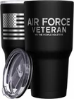Tea and coffee travel mug - This printed American flag tumbler is available in a capacity of 30 fl oz and is the perfect vacuum-insulated stainless steel tumbler for drinking your favorite beverage on the go. The vacuum construction keeps the army coffee mug well insulated and your drink hotter for longer. Patriotic design - Each patriotic tumbler is emblazoned with our Air Force Veteran design on one side and a proud USA flag on the other. Show your pride in your country every time you sip your morning coffee from your favorite proud veteran tumbler. High quality insulation - Keep your cold drinks chilled for up to 24 hours and hot drinks steaming for up to 6 hours with our double vacuum insulated tumbler. This veteran coffee tumbler features double-walled insulation, so you can enjoy your favorite beverage at the perfect temperature anytime, anywhere. Made in the USA - Crafted to last a lifetime, our exclusive US air force travel coffee mug has been proudly laser engraved right here in the USA in Las Vegas, Nevada. This robust double insulated tumbler can easily handle daily use on long car rides, business trips, or to and from the office. Maximum spill protection - Our stainless steel tumbler with lid is lined with copper. The clear lid included with our air force mug prevents spills or leaks, so you never need to worry about drink stains on shirts or tables ever again.