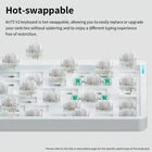 Translucent bottom shell design: The overall layout of the Air75 V2 wireless keyboard is similar to that of the Air75, featuring a high-quality aluminum frame. However, we have adopted a new translucent design on the bottom case of the keyboard, which makes the internal structure of the Air75v2 clearly visible and fully utilizes the overall aesthetics of the keyboard. At the same time, we've added two height stands to the bottom of the keyboard to make it even more comfortable to use. Supports multi-device connectivity: Air75 V2 wireless mechanical keyboard is compatible with Mac/Windows/Linux/Android/iOS,and supports Bluetooth 5.1 connectivity, 2.4g connectivity and wired connectivity modes, which allows you to connect up to 4 computer devices at the same time and switch between these computers to use them, which can satisfy a wide range of entertainment office needs Cool RGB Backlit Effect: The backlight of Air75 V2 has more than 21 different color effects, which can be easily changed using key combination. Through console, you can even limitlessly customize lighting effects(the keycaps are not backlit).We also added two RGB light bars on each side of the Air75 V2's aluminum frame. The left bar shows caps lock and connection mode, while the right bar shows battery level and system mode, so you can see the status of your keyboard more visually. More fun to use: Air75 V2 gaming keyboard with QMK/VIA. We believe with the full realization of our hardwares' potential under the new firmware, its open source code, the endless key remapping, light customization and other creative possibilities VIA offers our users, the fun has truly started(Wrist rest to be purchased separately) Long endurance: The battery capacity is 4000mAh, it can be used continuously for 35~57 hours(Experimental test results of keyboard backlight fully turned on), easily meet the work demand of a week.Turn off the keyboard light and it can be used for up to 220 hours (experimental test results). PBT keycaps: The keycaps are made of PBT material, providing you with a more comfortable touch, while the characters on the keycaps will not lose their color when used for a long time.
