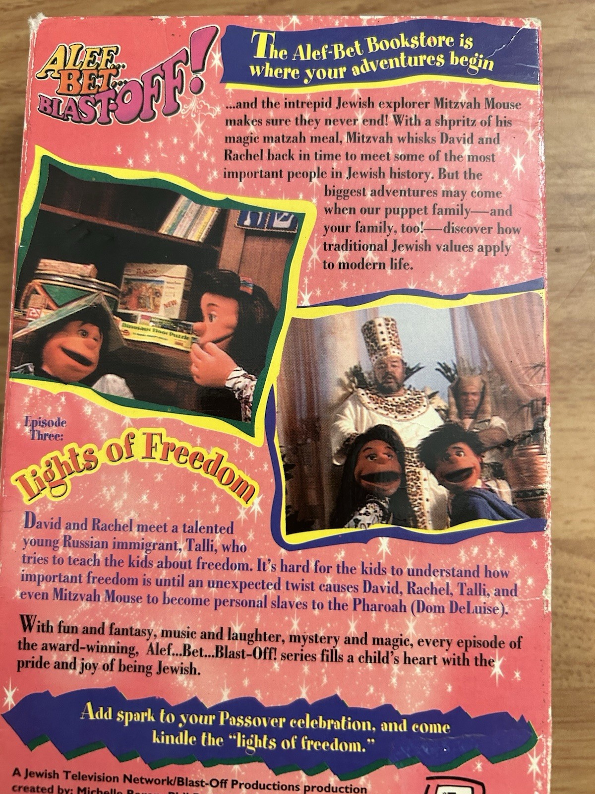 The product is a VHS tape of the "Lights Of Freedom" cartoon show featuring Jewish puppets, aimed at kids. The show is in English and follows the NTSC signal standard. Starring Elliott Gould and produced by Blast Off Productions, this family-friendly adventure offers a fun and educational experience for children. With a G rating, this full-screen edition from the United States is sure to entertain and inspire young viewers. Good condition. The dust sleeve has some wear.